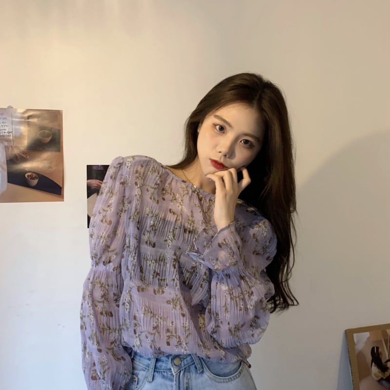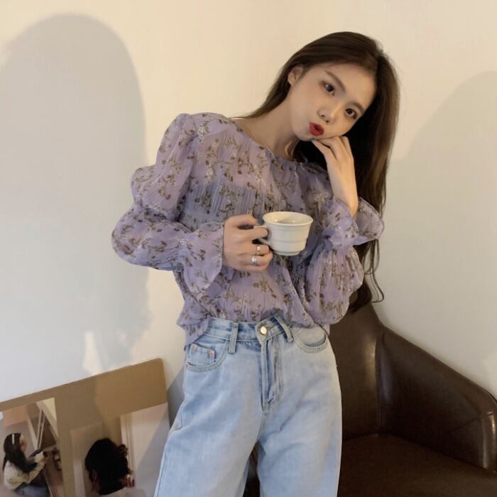 スリムなフローラルシャツトップスのマイクロ透過性プリーツ長袖シフォンシャツ女性秋のニッチなデザインセンス kumikum48745579715