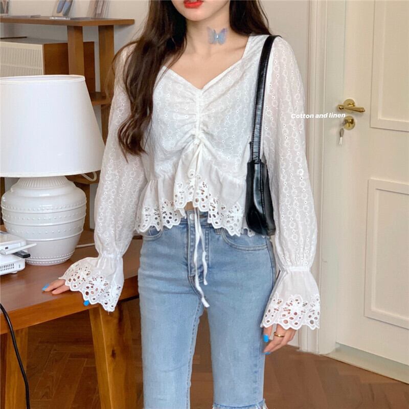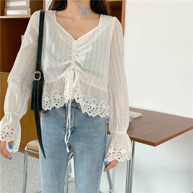 スーパーフェアリーホローかぎ針編みホワイトスクエアカラーニッチシャツトップレディースサマールーズショートロングスリーブシャツ kumikum82363955368