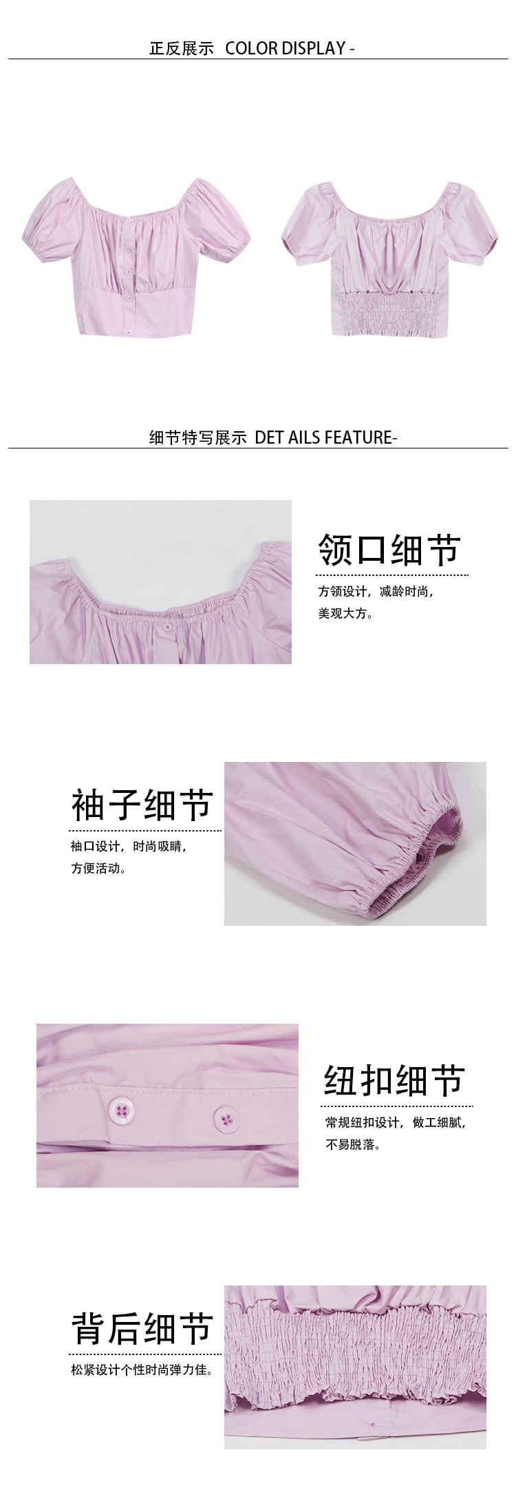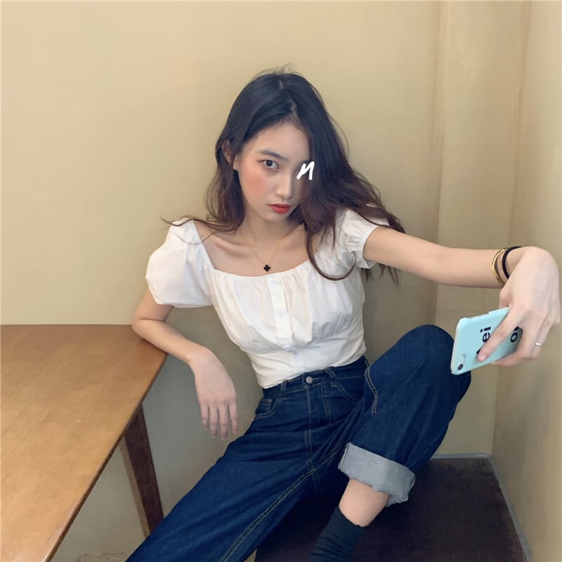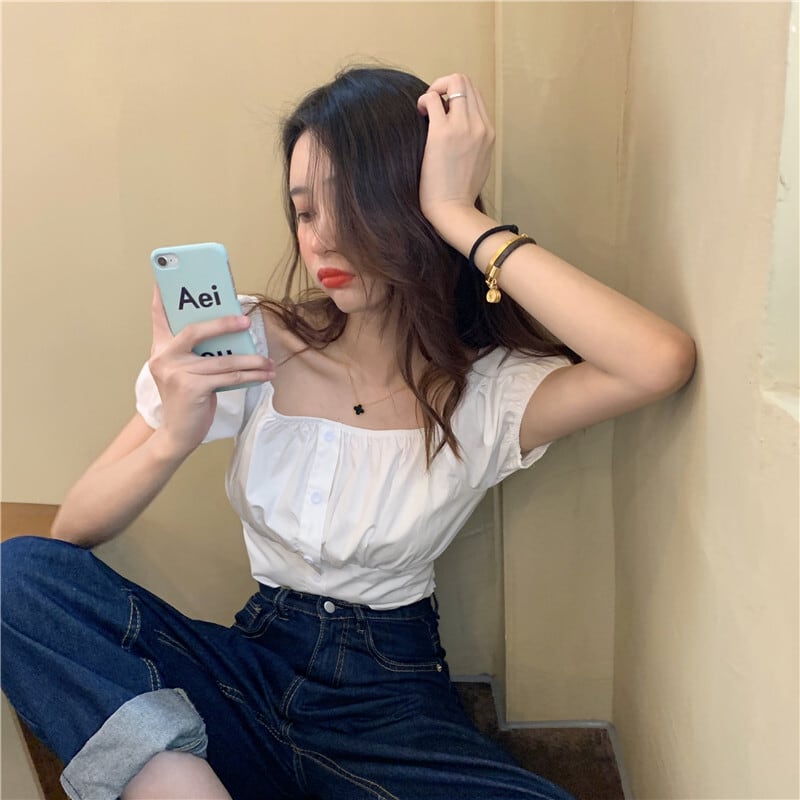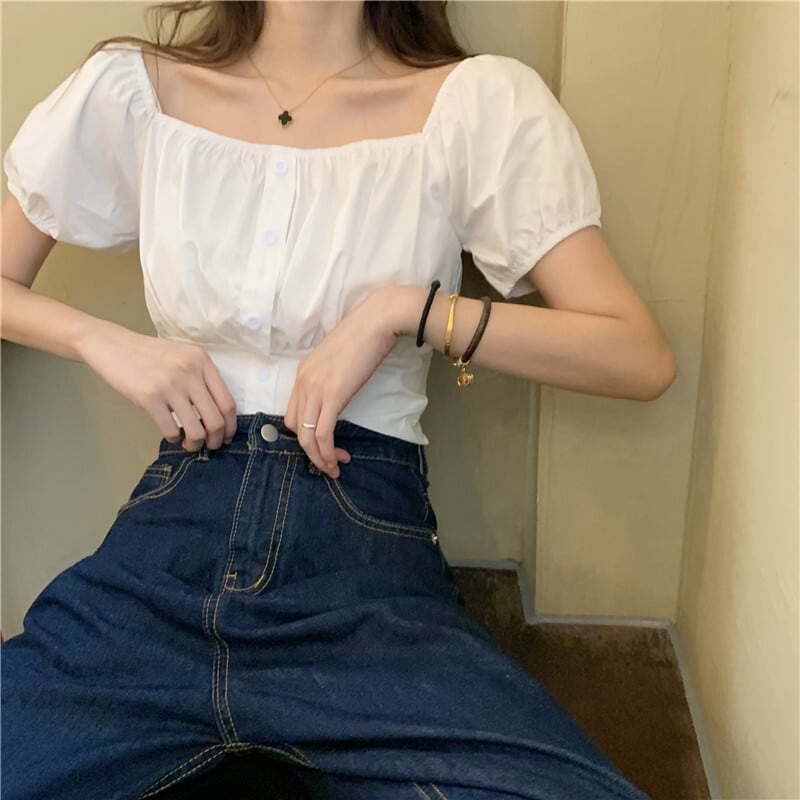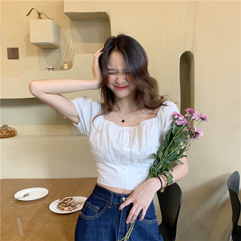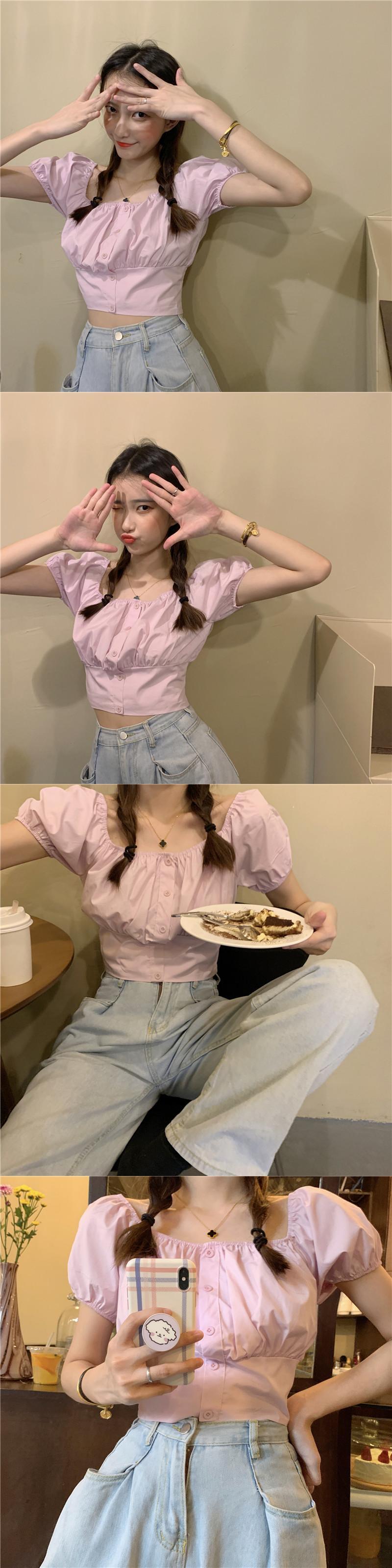 デザイン感優しい風スクエアネックウエストショートシャツbmトップ女性夏ニッチバブルスリーブ半袖シャツトレンド kumikum89939846091