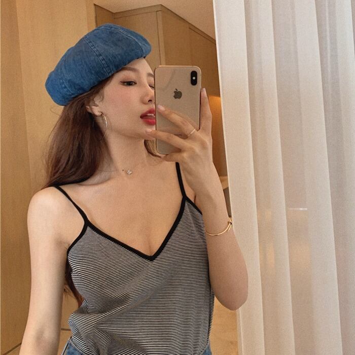 レトロなVネックノースリーブストライプキャミソールレディースサマースキームショートスリムベースシャツトップ kumikum49551226582
