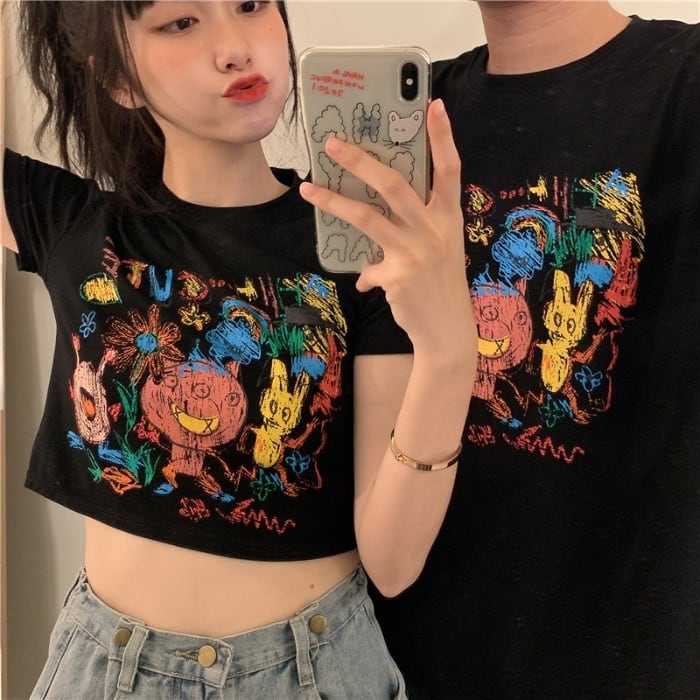 プリントカップルTボトミングシャツ女性夏ルーズ半袖Tシャツブラックショートクロップトップインタイド kumikum44349399532