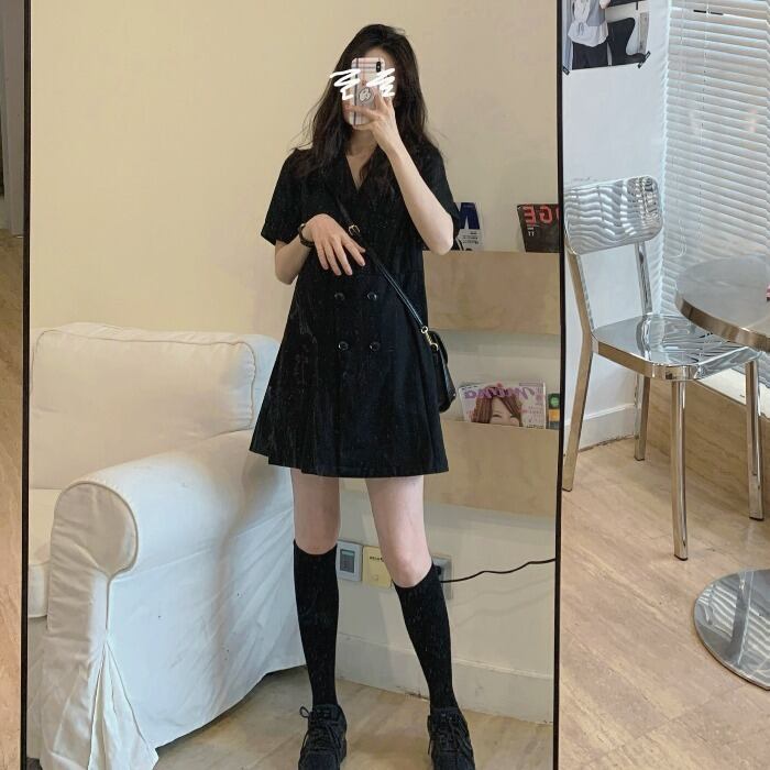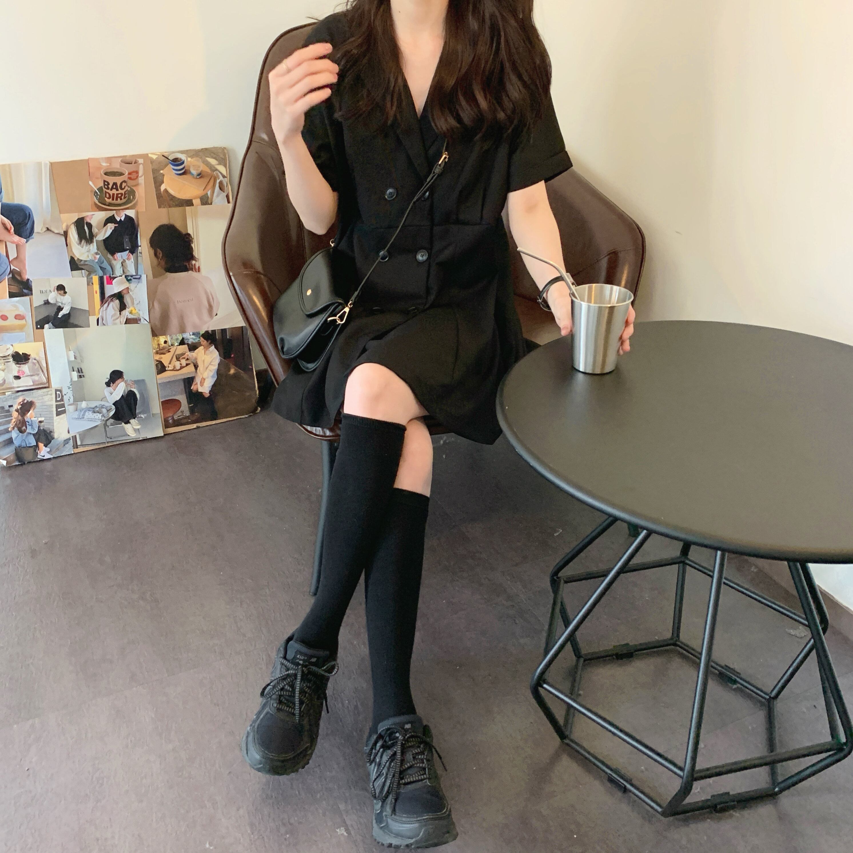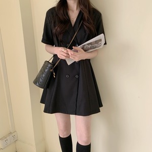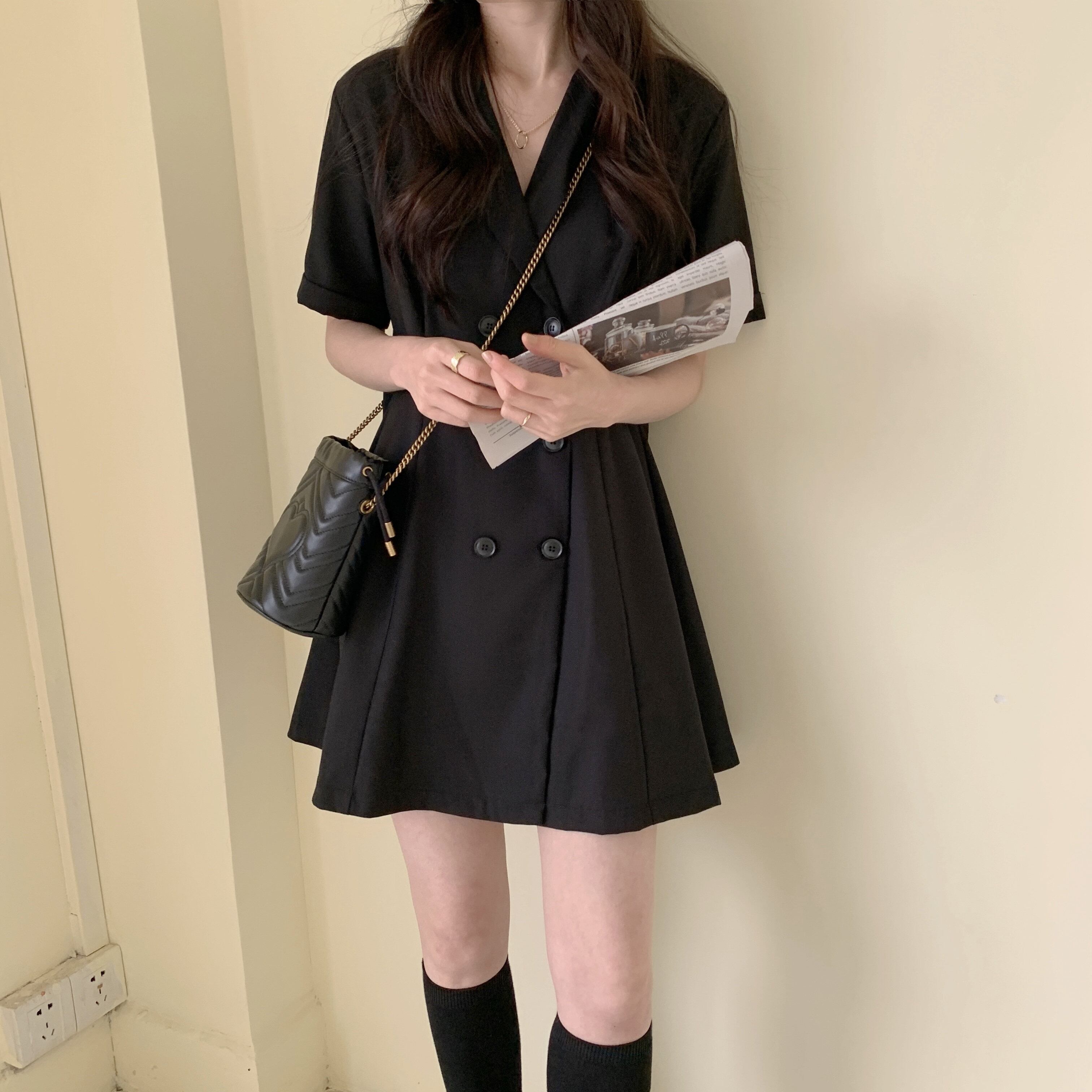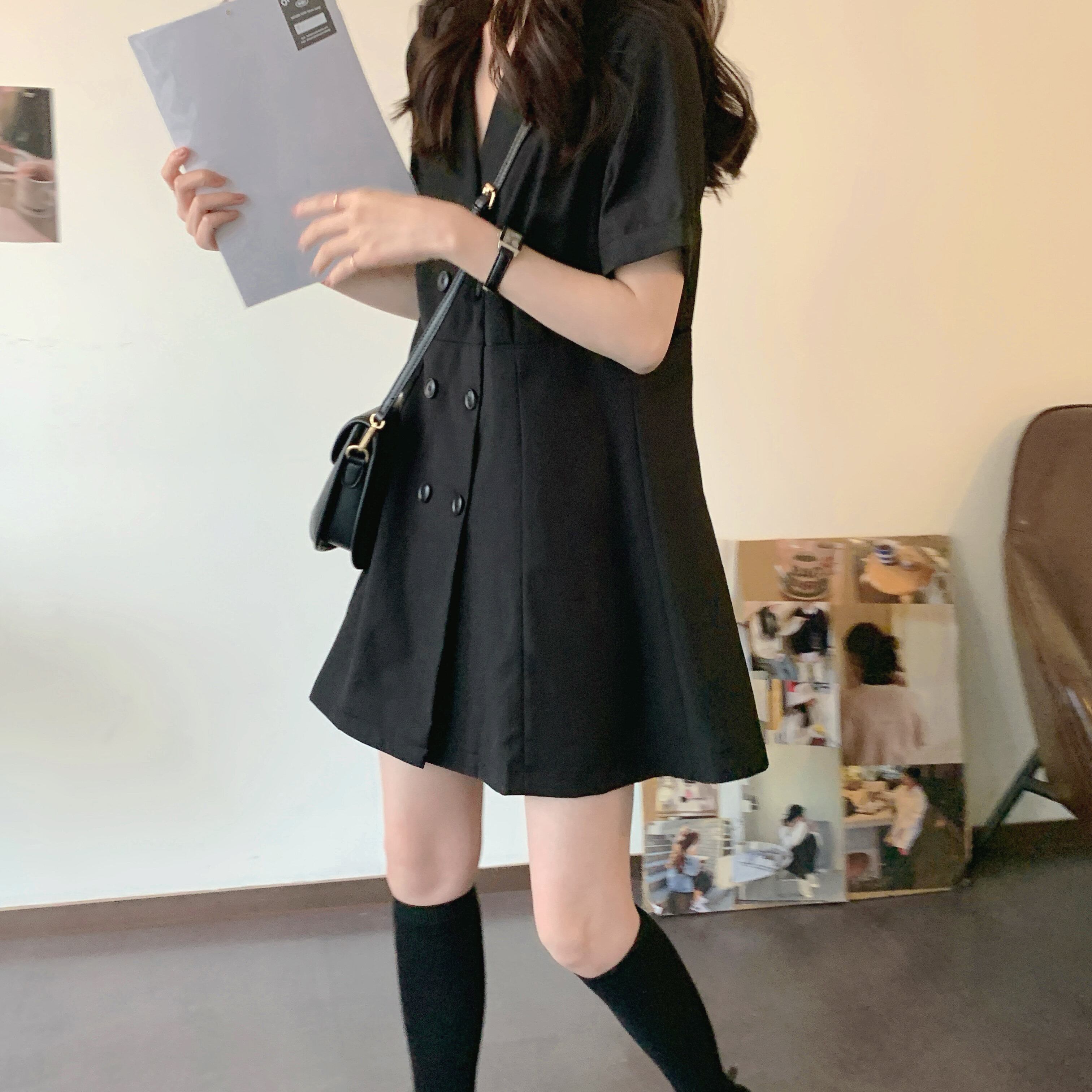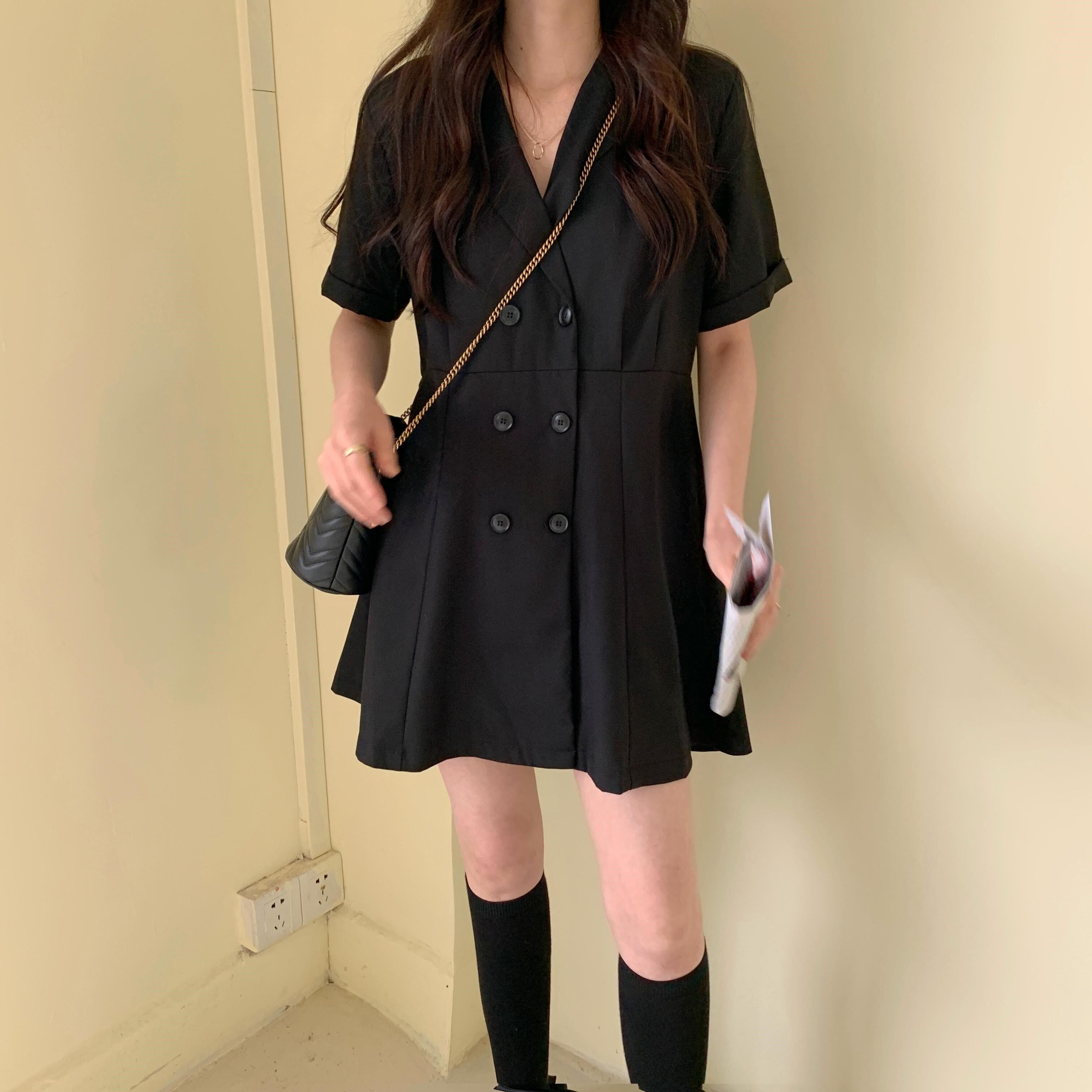 スーツの襟は薄い黒のスカートの女性のリトルブラックドレス2020新しい夏の気質スリムレトロ半袖ドレス kumikum90283385794