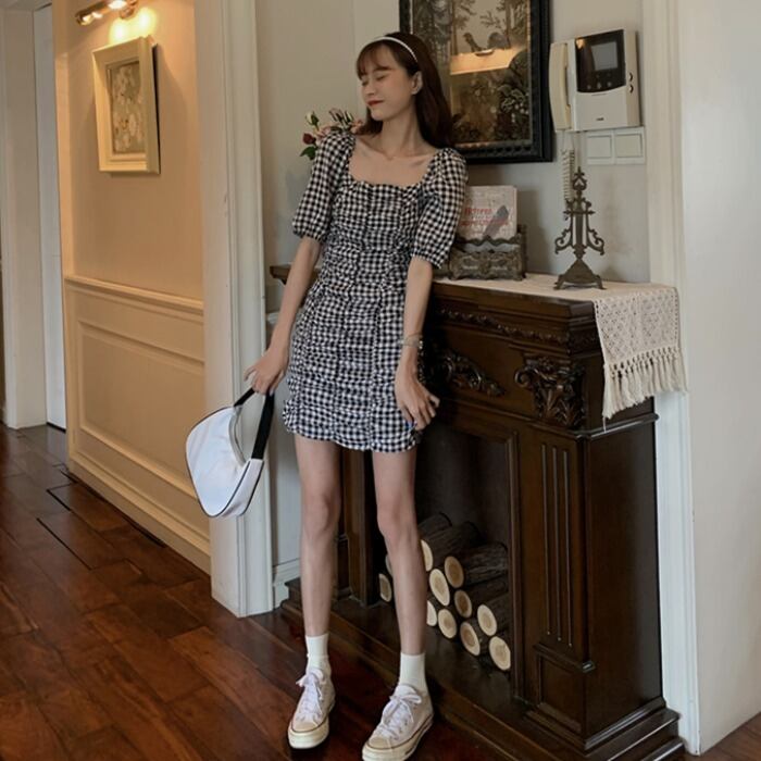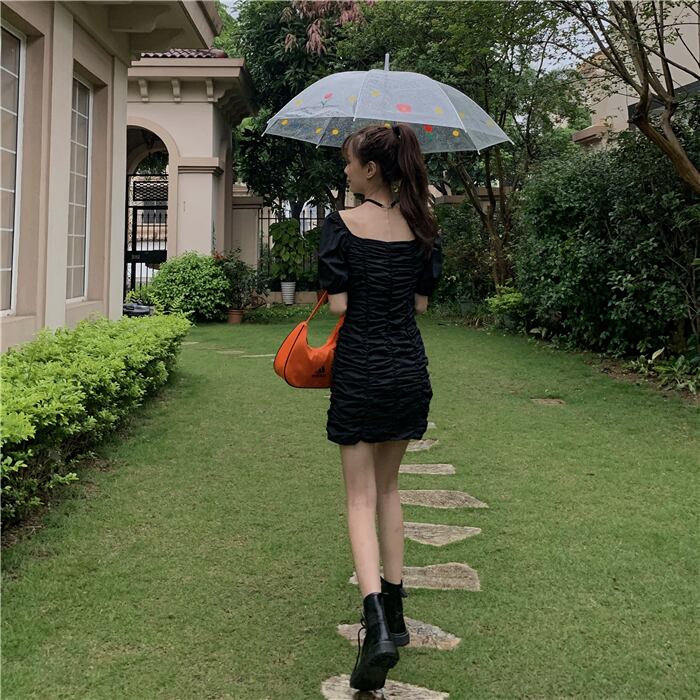 ブラックレトロスクエアカラースリムパフスリーブスカート女性夏フレンチスタイルウエストスリミング半袖ワンピース kumikum85073060586