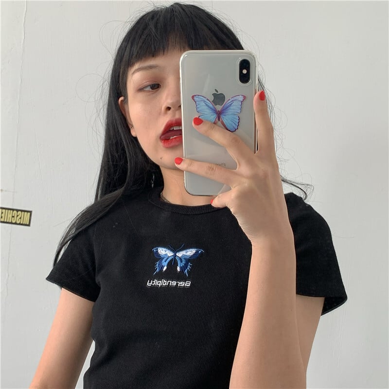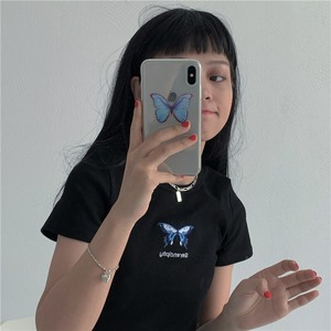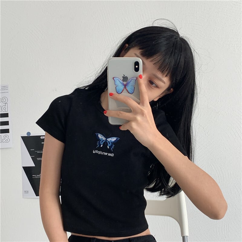 ゴーストホースバタフライ刺繡ブラックハイウエストボトミングシャツTシャツ女性夏スリム半袖トップインタイド kumikum45720771368