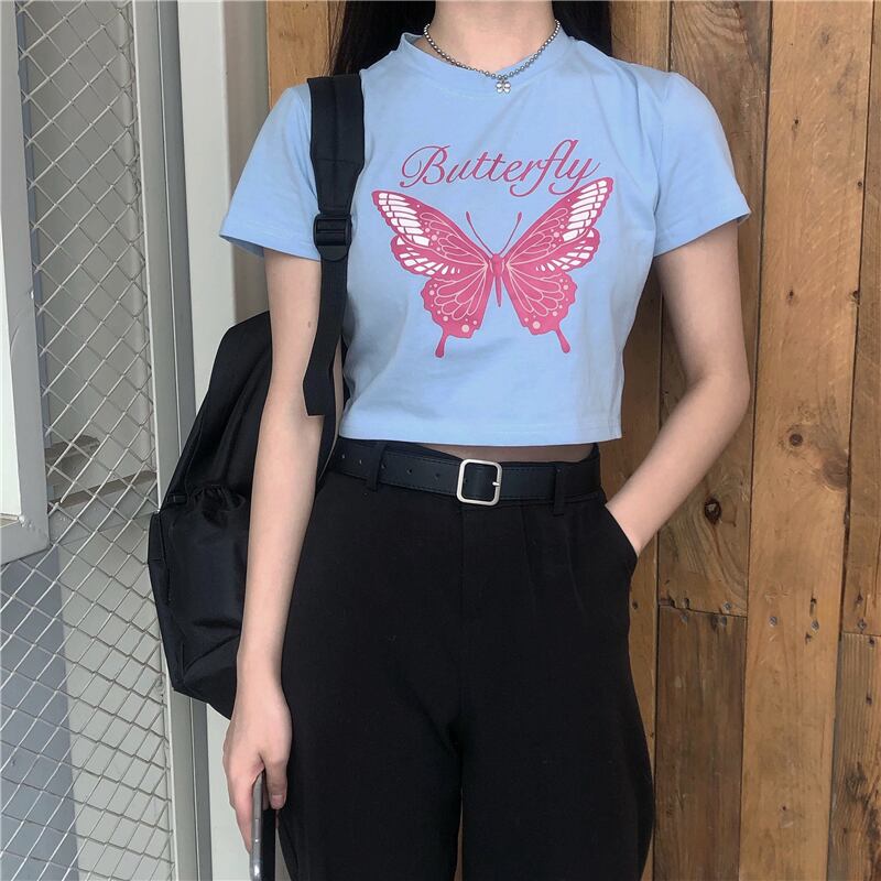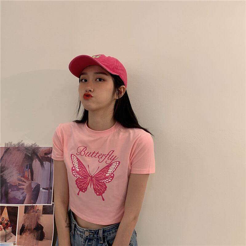 バタフライプリントラウンドネック学生半袖Tシャツレディースサマーシックバージョンのショートアンビリカルボトミングシャツトップタイド kumikum82282503180