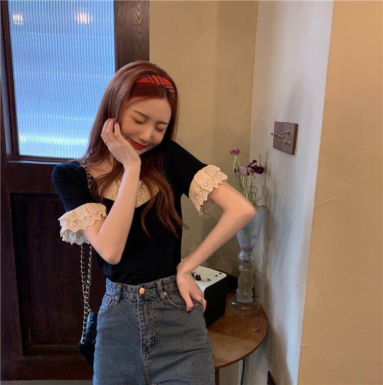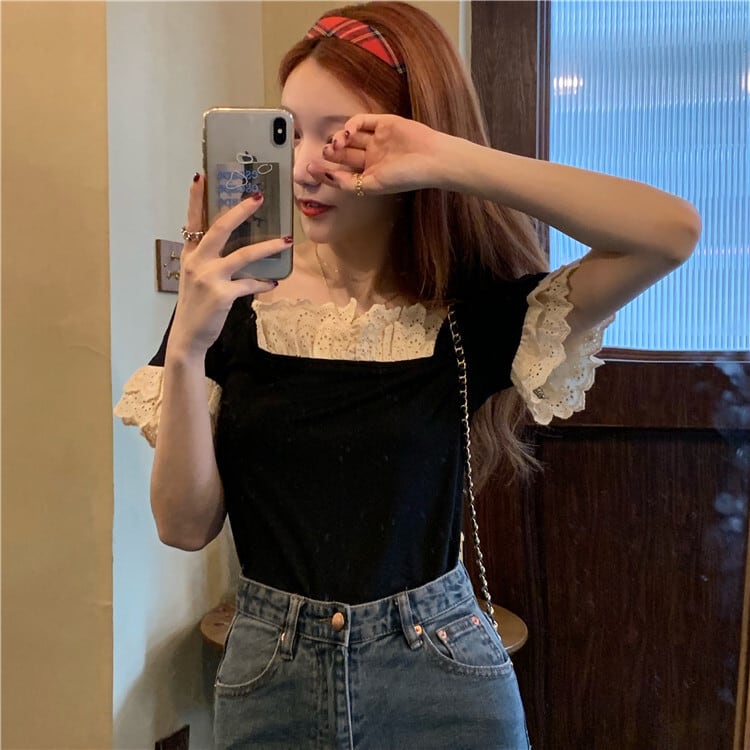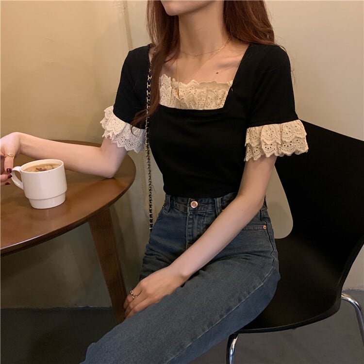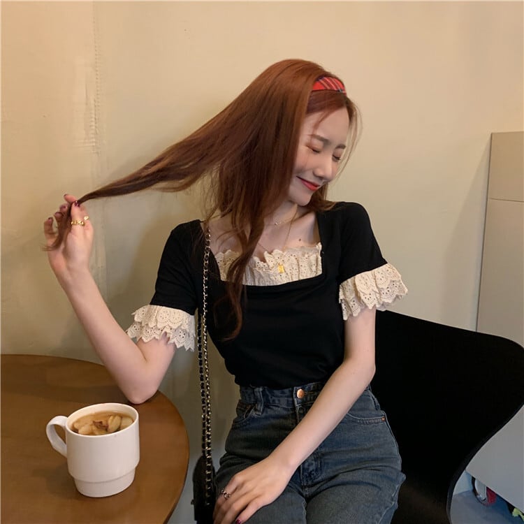 レースレトロスクエアネックブラックTシャツトップ女性バージョン2020新夏スリム半袖ボトミングシャツ kumikum10507630489