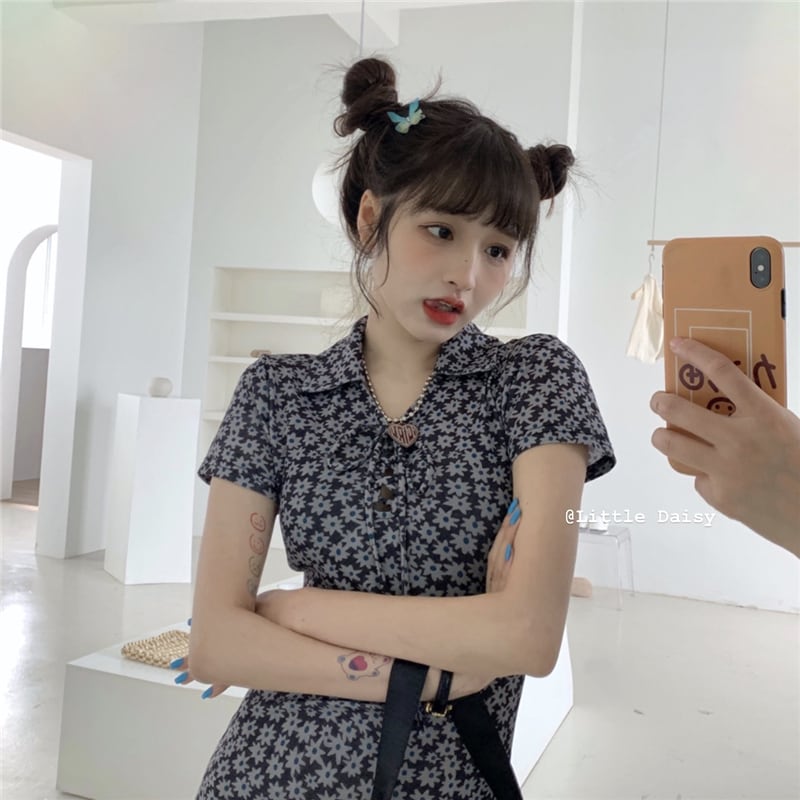 ブラックスモールデイジーフローラルウエストスカートレディーススタイルサマースリムスリミング半袖ワンピース kumikum25562084250