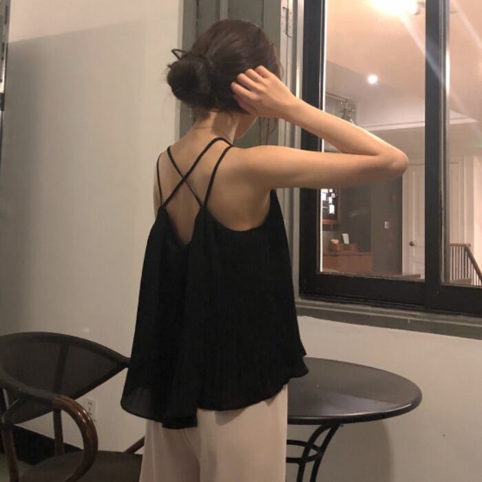クロスバックセクシーアウターウェアノースリーブベストサスペンダー女性夏プリーツショートインナーベースシャツシフォントップ kumikum85011059039