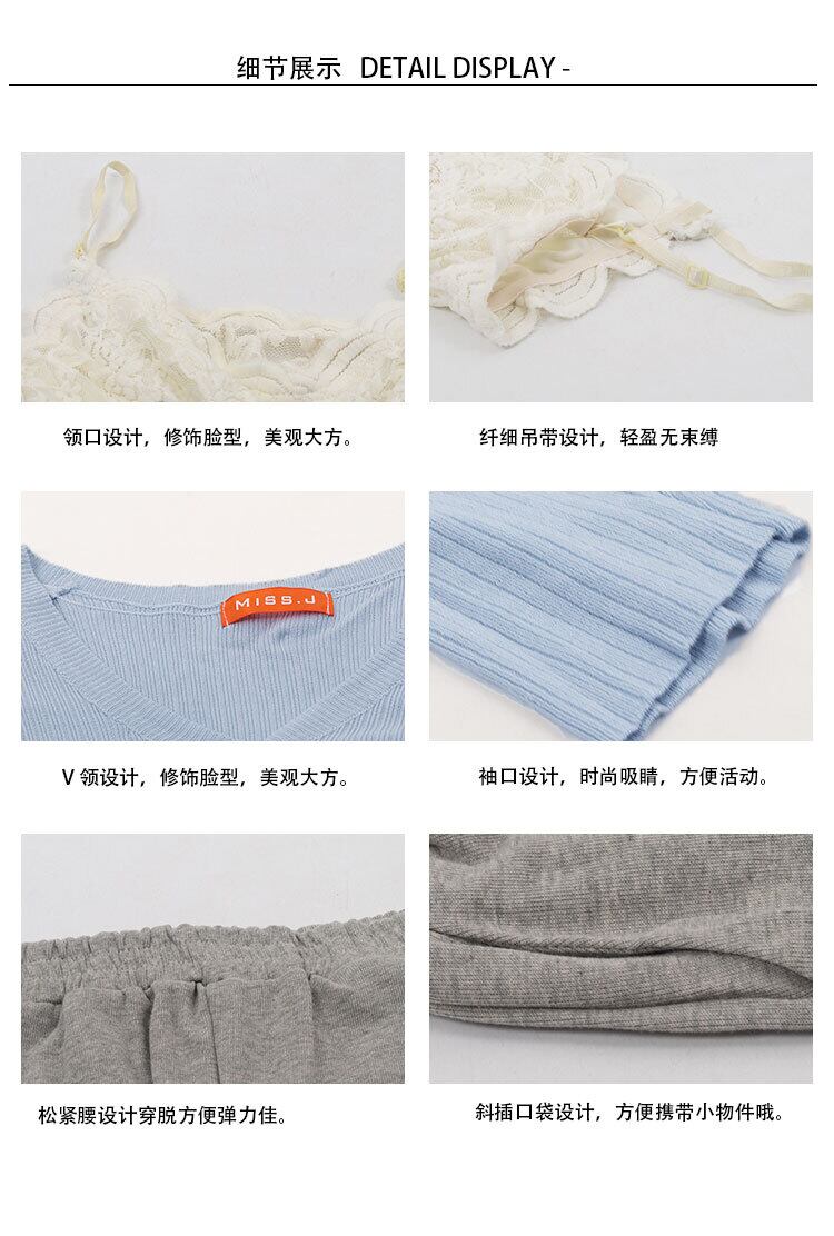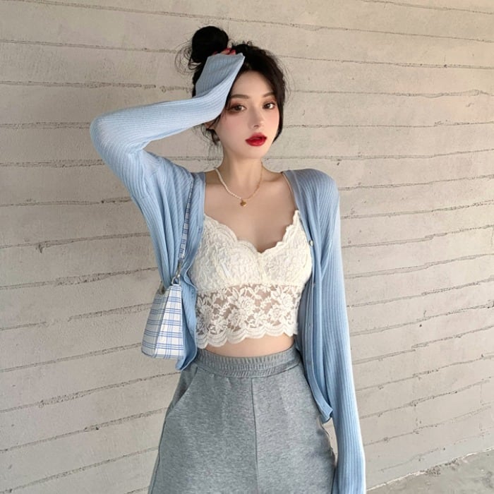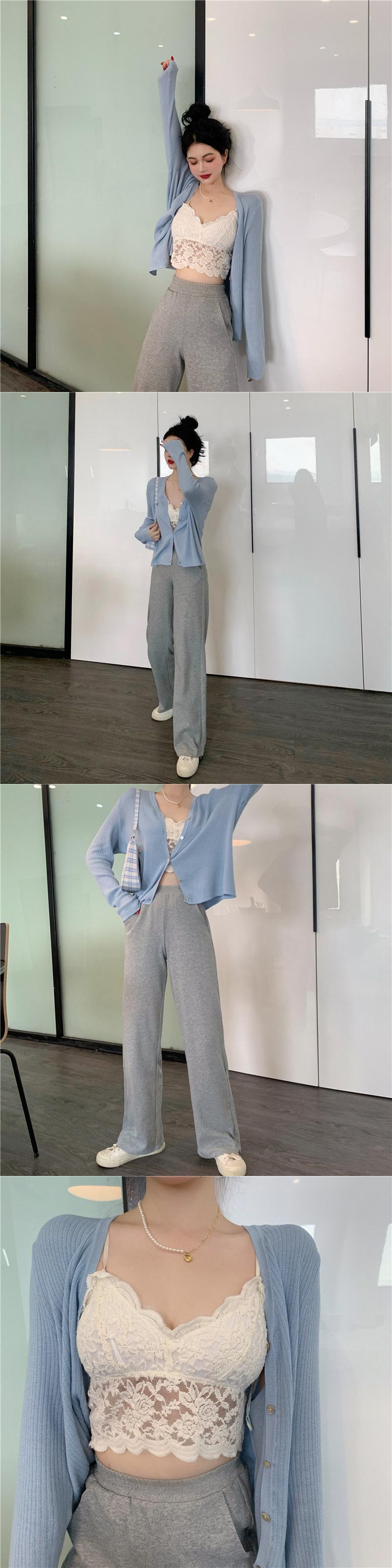 色:ブルーカーディガン,レーススリング,グレーストレートパンツ