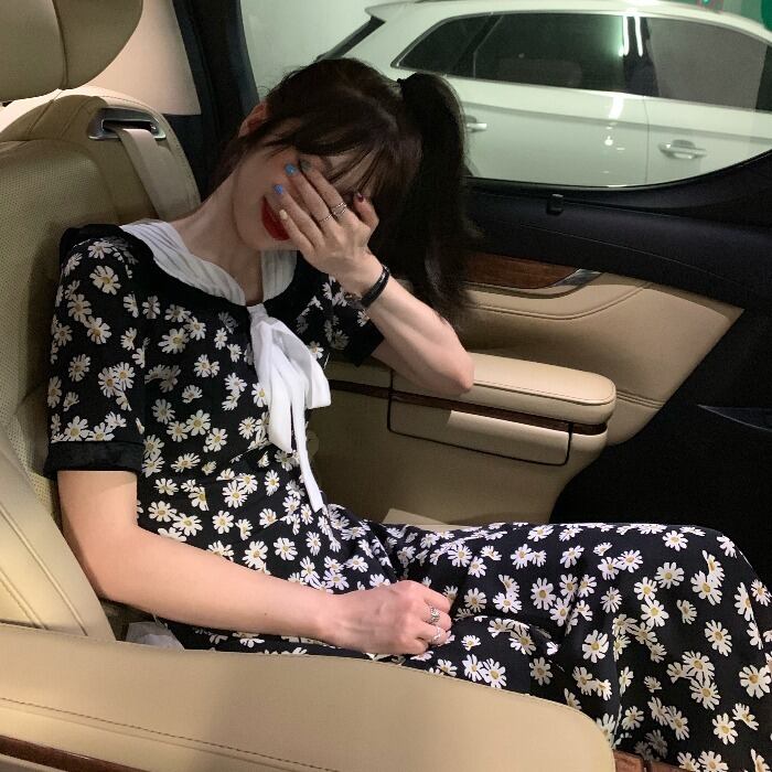リトルデイジーレトロフローラル半袖スカートレディースフレンチサマーウエストスリミングミドル丈気質スリムワンピース kumikum65104426715