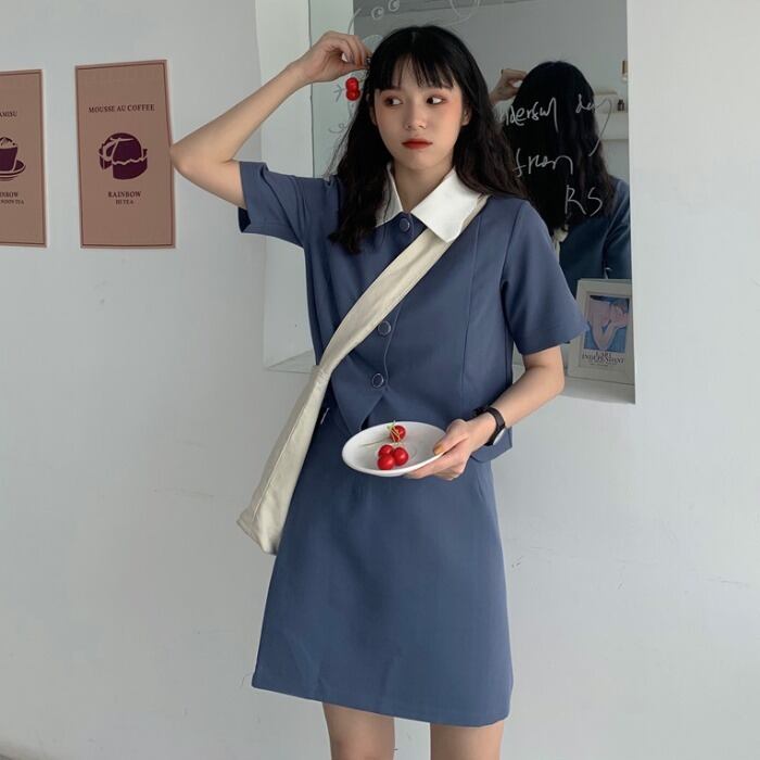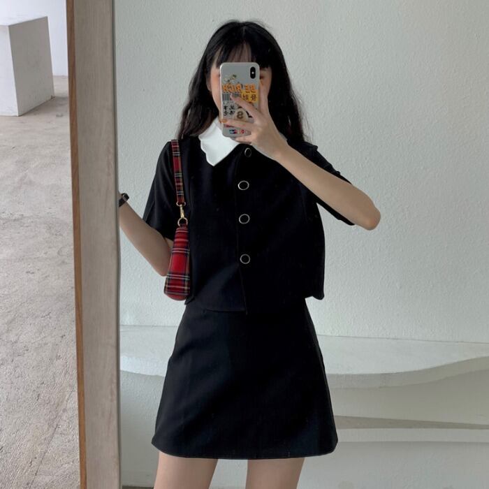 年齢を減らす学生ファッションスーツ女性の夏の半レースカラー半袖シャツシャツツーピースAラインスカート kumikum93283774521