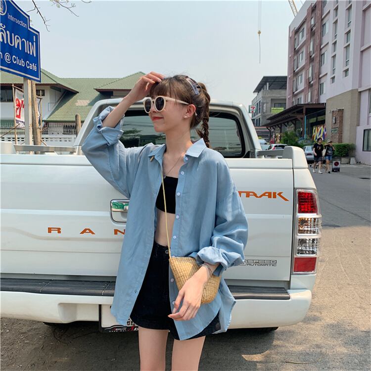 ロングブルーカジュアルシャツジャケット女性夏スタイルルーズ気質レトロ長袖シャツジャケットのBF風 kumikum57227815013