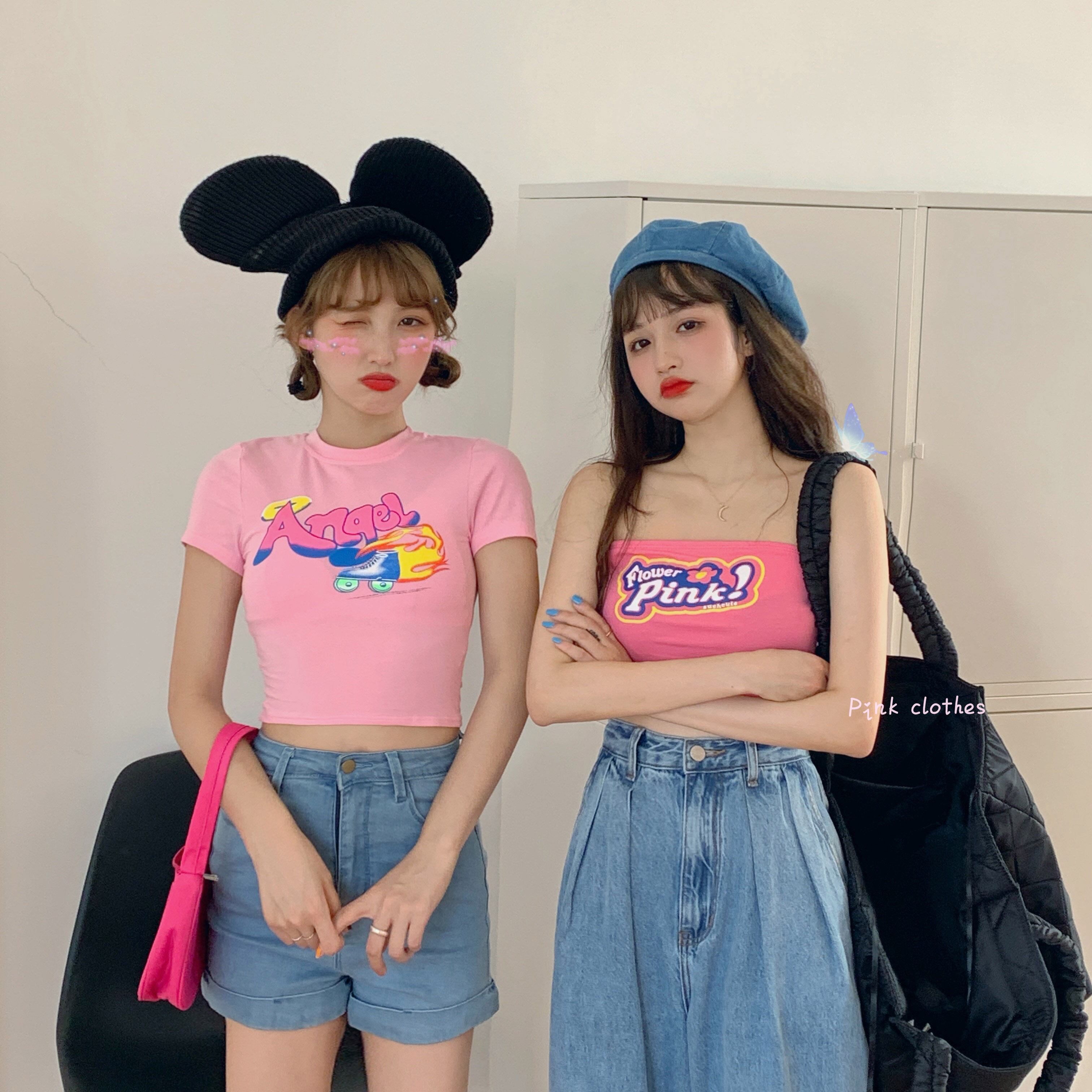 ガールフレンドの女性の夏のピンクと柔らかいプリントのショートボトミングシャツの女性バージョンのスリムで薄いワイルドな半袖Tシャツトップ kumikum52419224023