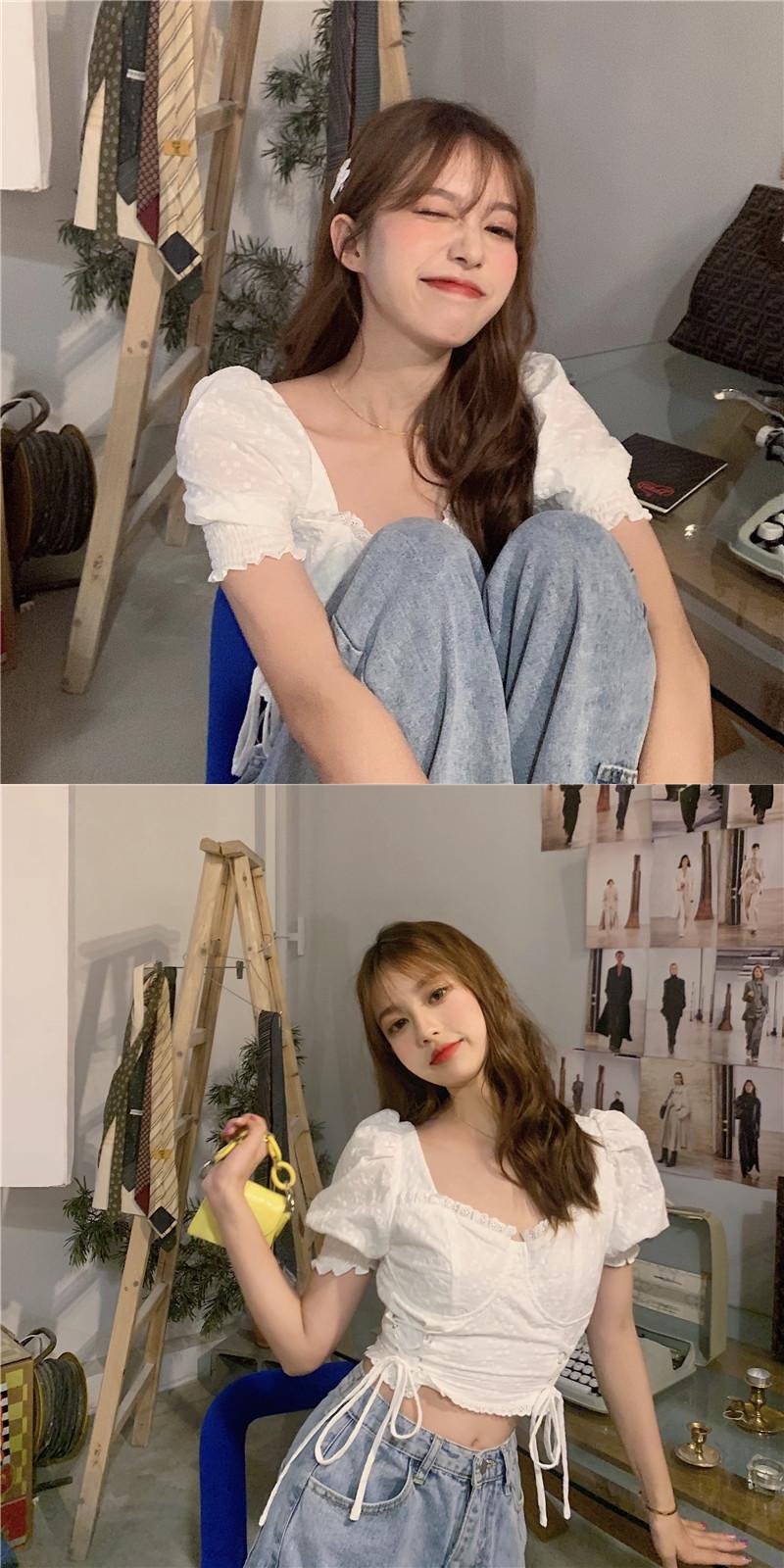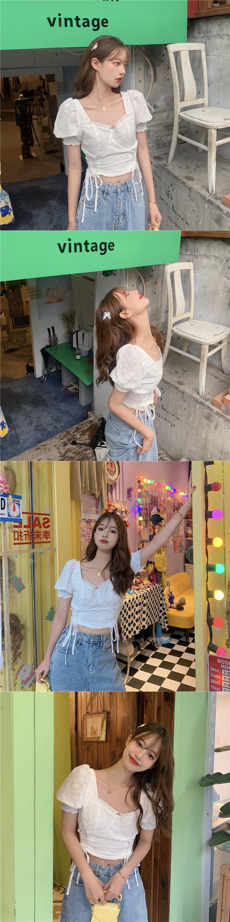 フランスのレトロなスクエアカラー露出鎖骨シャツトップ女性夏気質ショートへそ白いニッチ半袖シャツ kumikum38207301890