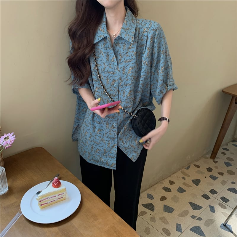 レトロニッチフローラルブルー半袖シャツレディースサマーシンルースシフォンシャツシャツトップトレンド kumikum42452935043