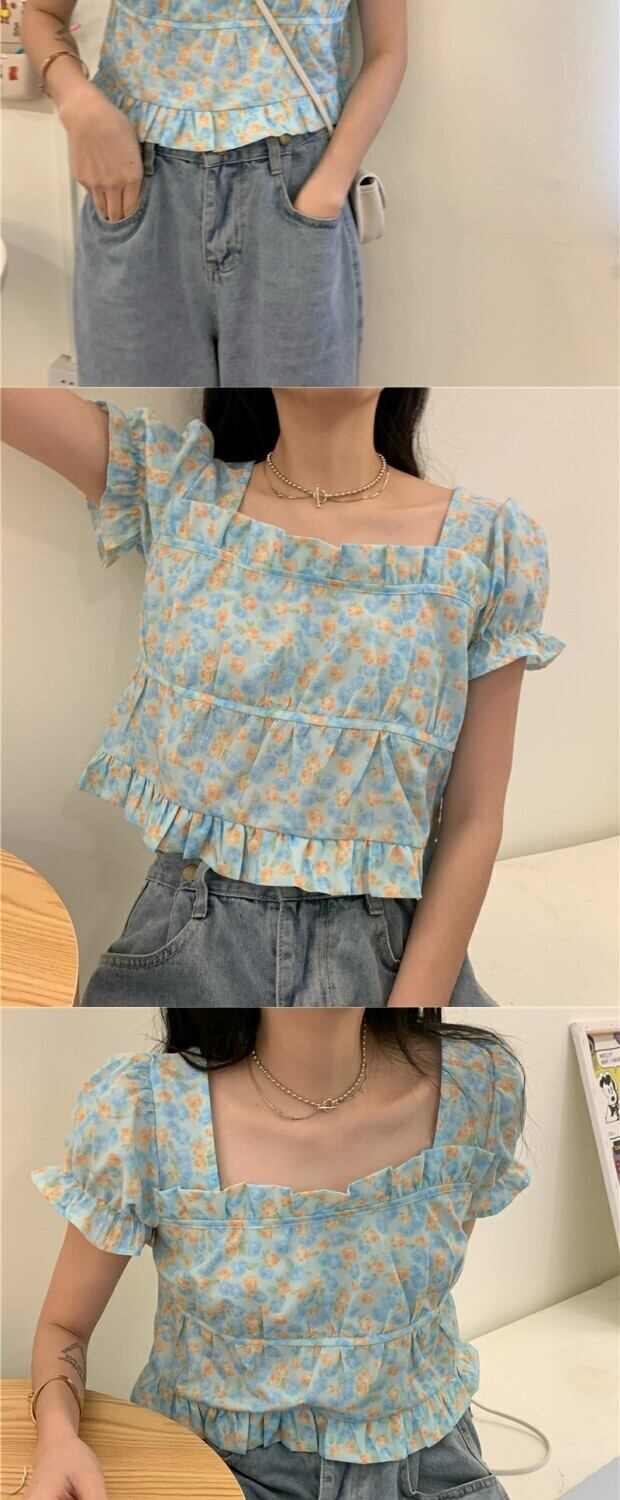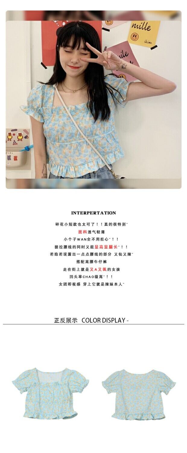 フレンチスクエアカラースウィートフローラルシャツレディースサマーショート半袖シャツ、木製耳付き2020ニュートップ kumikum14391474015