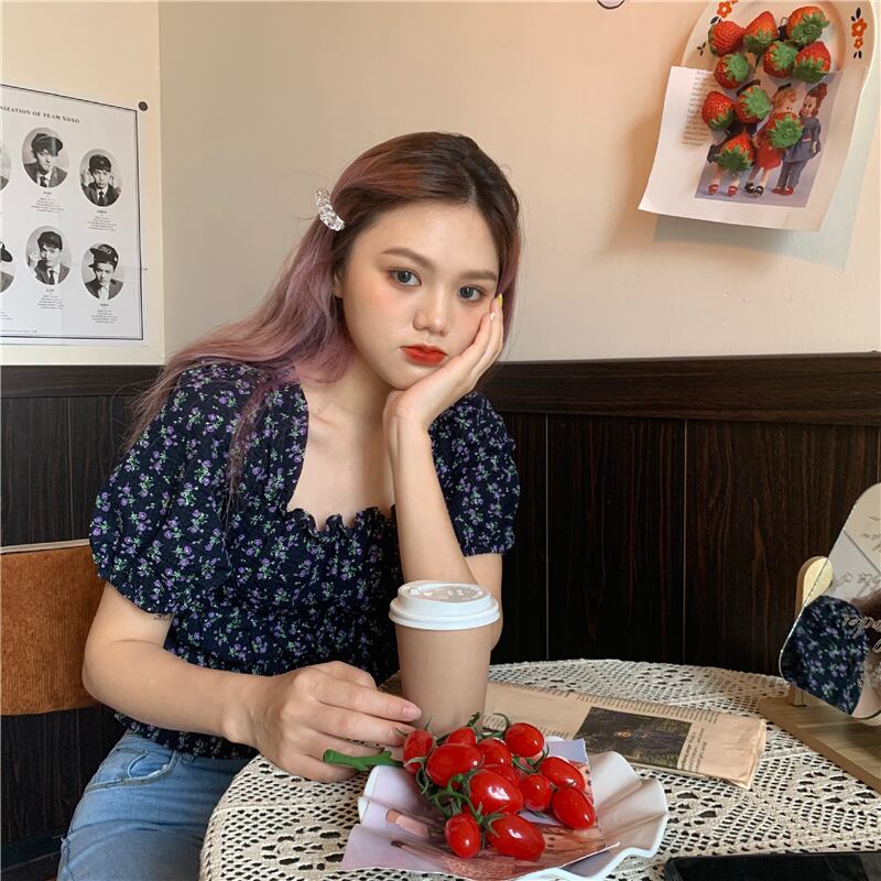 スタンダードフローラルスリーブカラーシャツ トップス レディースサマーショートスリムウェスト半袖 レトロ ハーフスリーブ 夏物 花柄 スクウェア kumikum91061692413