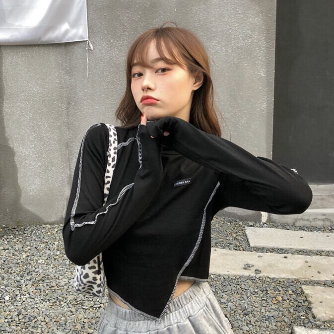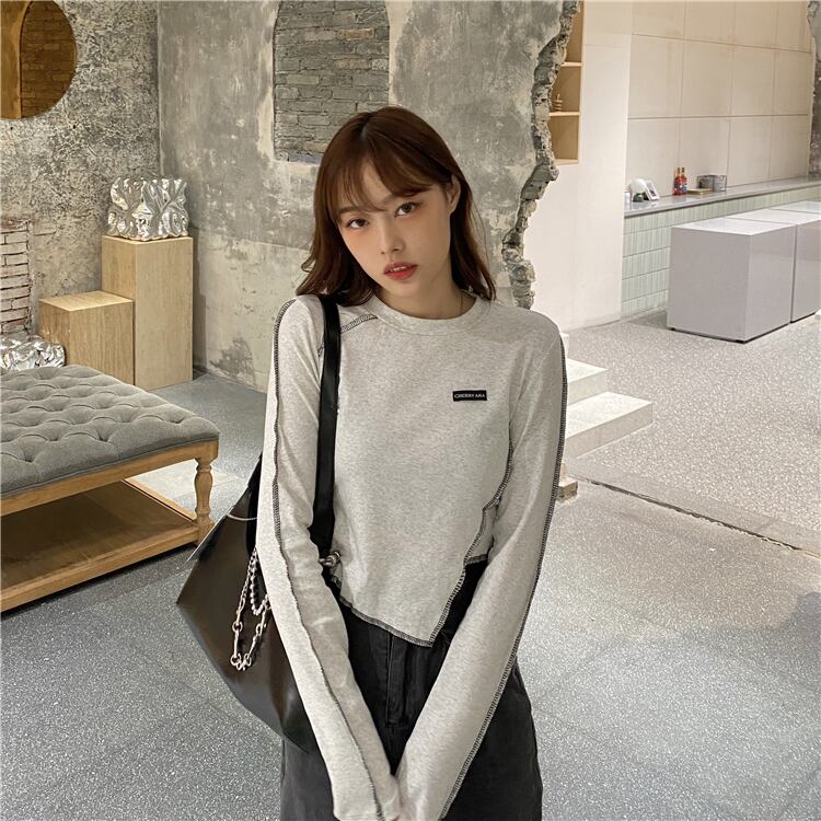 ラインショートトップス レッドオータムスリムTシャツ レディース ロング 秋物 kumikum70295253378