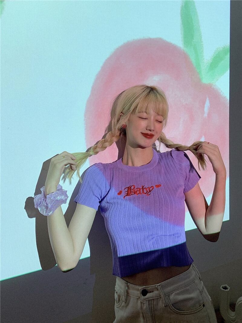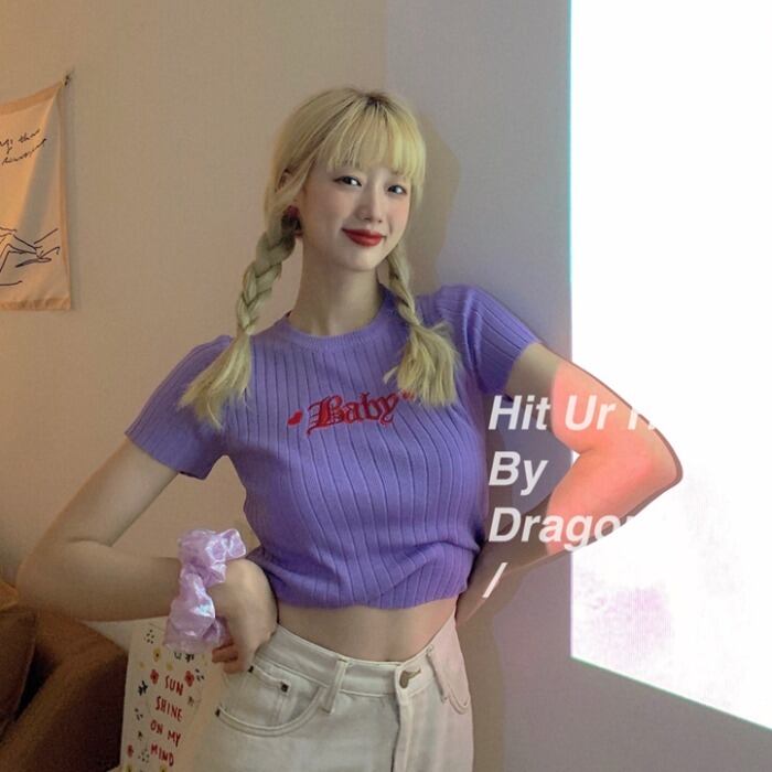 レッドショートスリムニットセーター トップス レディースサマー半袖スリーブシャツ Tシャツ ハーフスリーブ 刺繍 夏物 kumikum32386920427