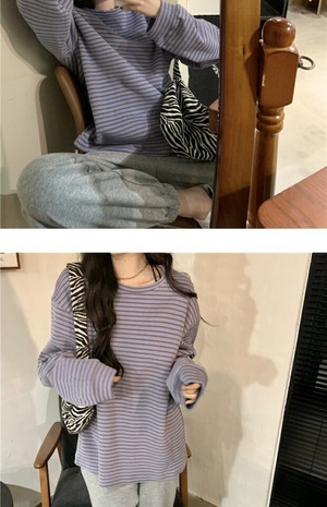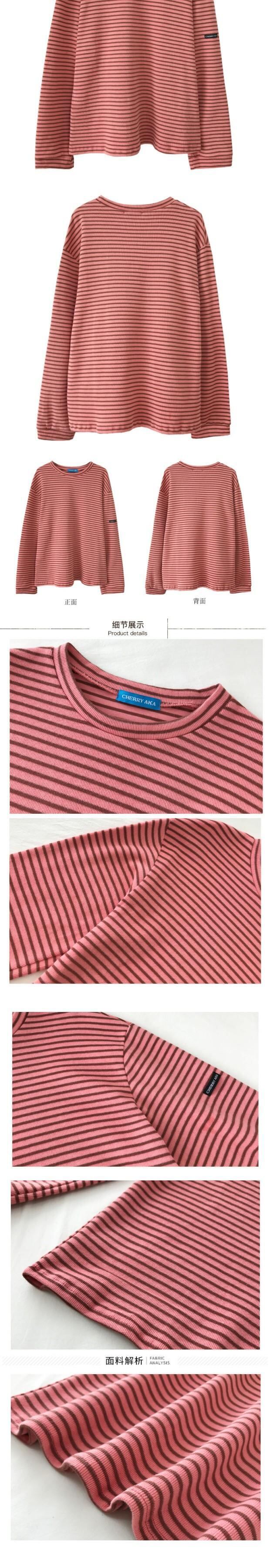 レッドカラーストライプラウンドネックシャツ スプリングルーズTシャツ ロング 春物 Oネック kumikum88930235748