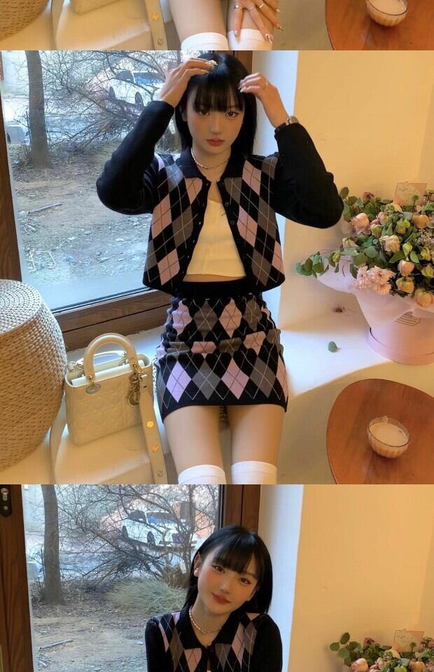 色:ダイヤモンドチェックスカート,ダイヤモンドチェックカーディガン