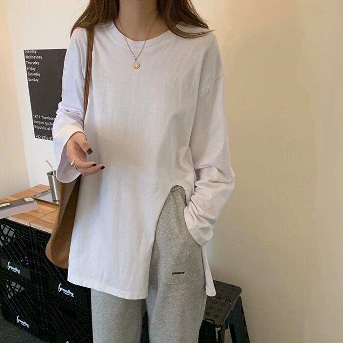 ベーシックスタイルラウンドネックシャツ トップス スプリングルーズ長袖スリーブカジュアルTシャツ ロング 春物 Oネック kumikum71728648080