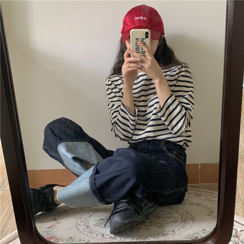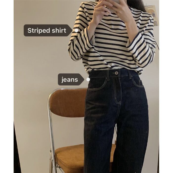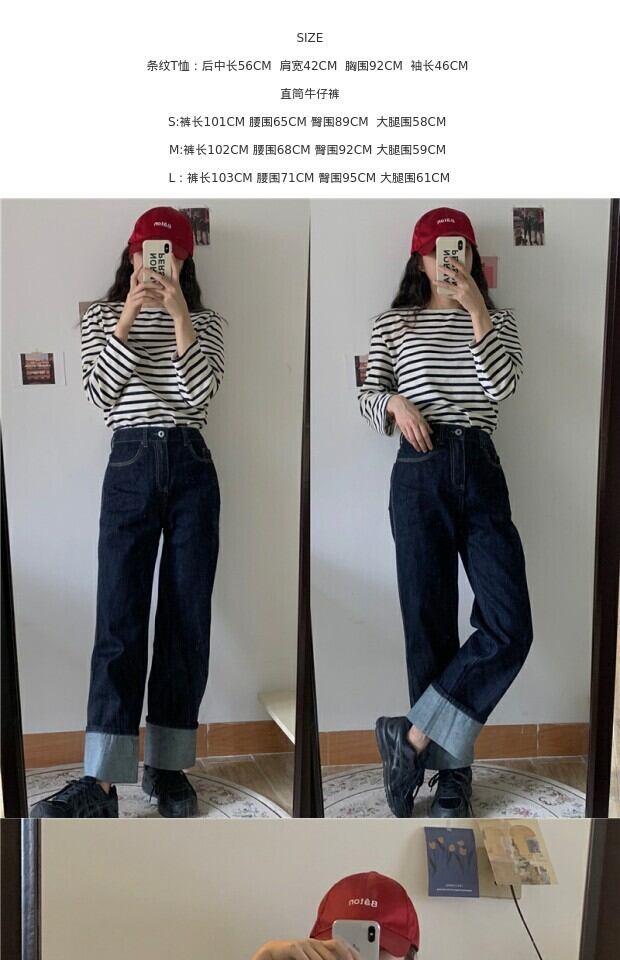 色:ストライプTシャツ,牛ストレートレッグジーンズ