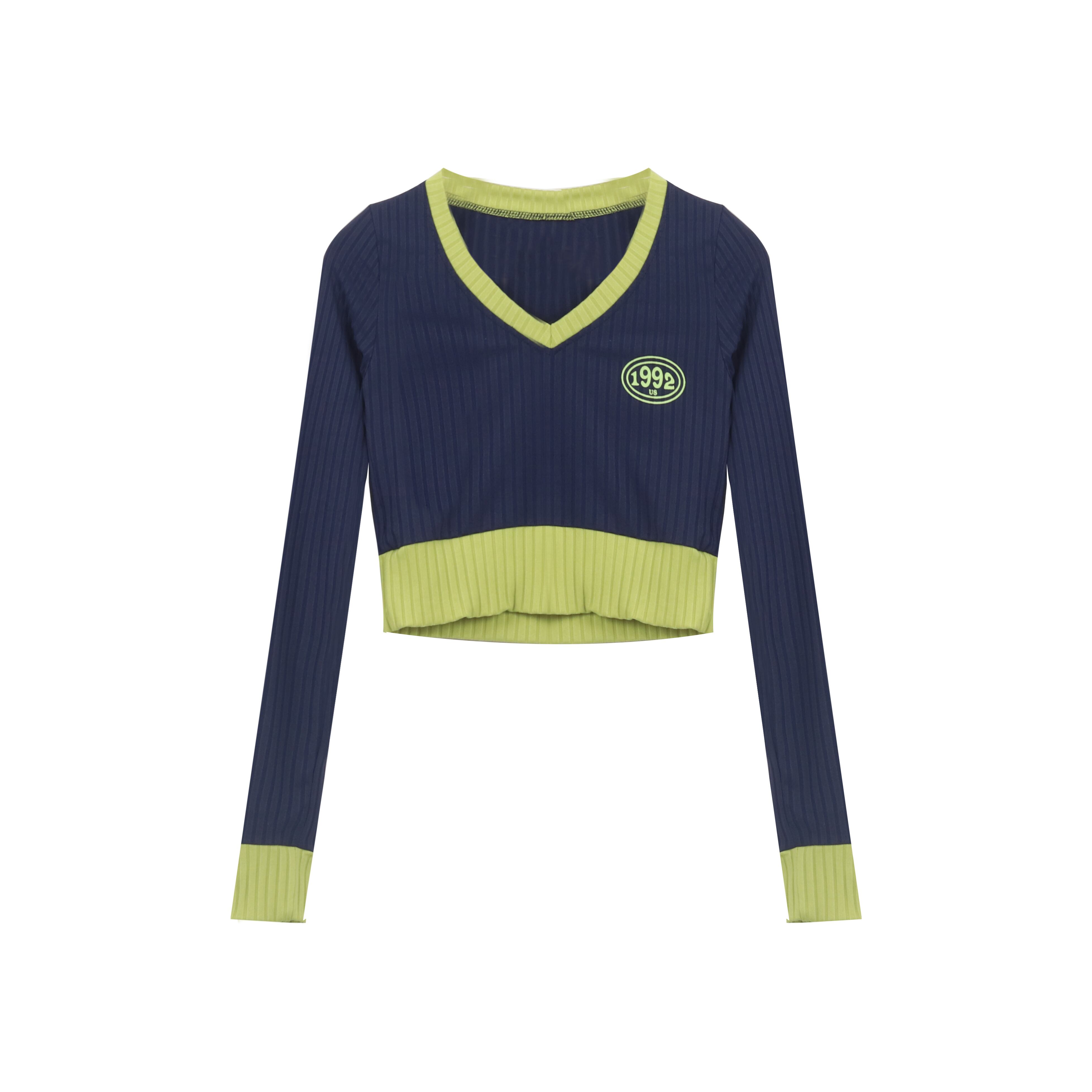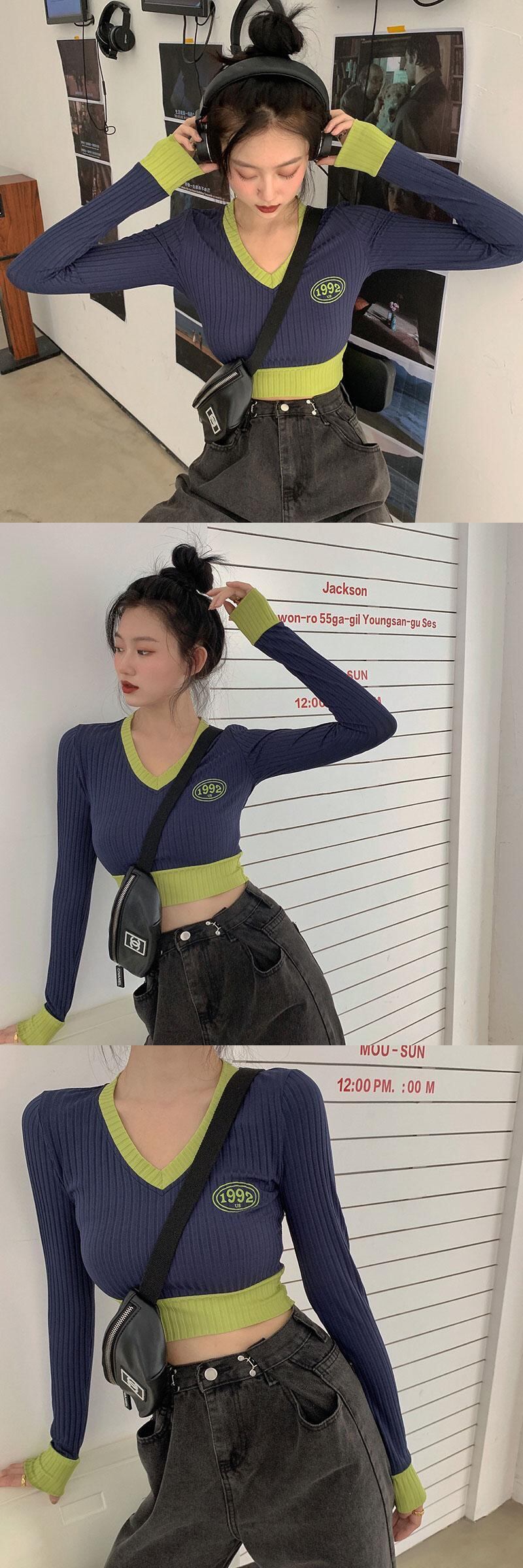 カラーショートクロップドセーター スプリングストレッチスリムシャツ 薄手長袖スリーブVネックトップス ロング エラスティック 伸縮 春物 kumikum66356874575
