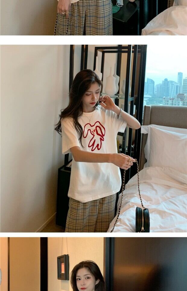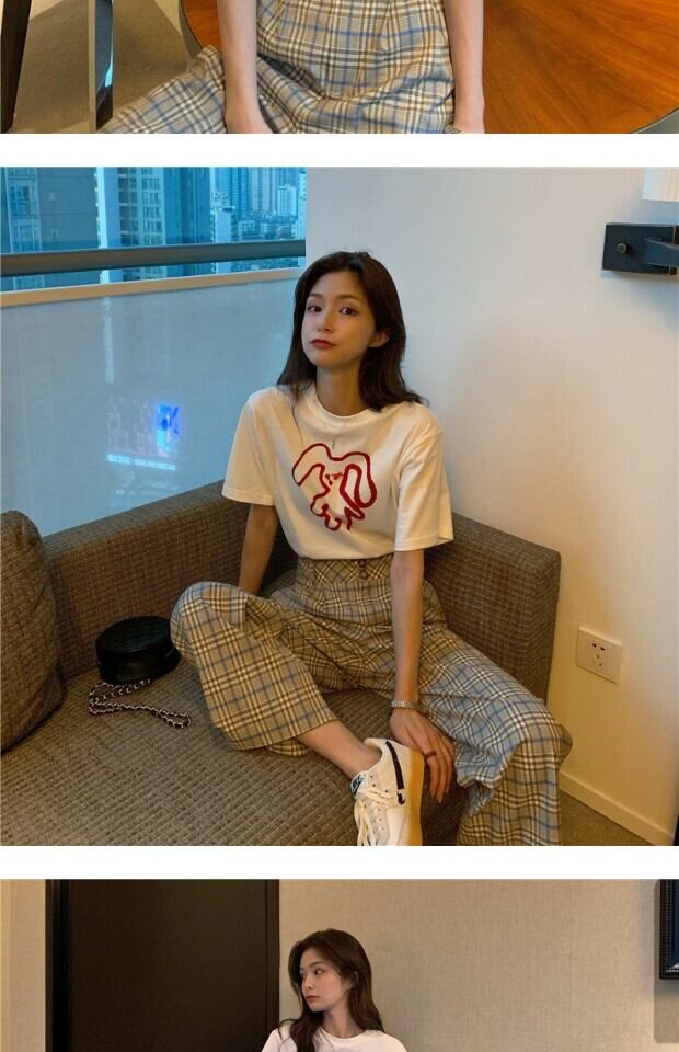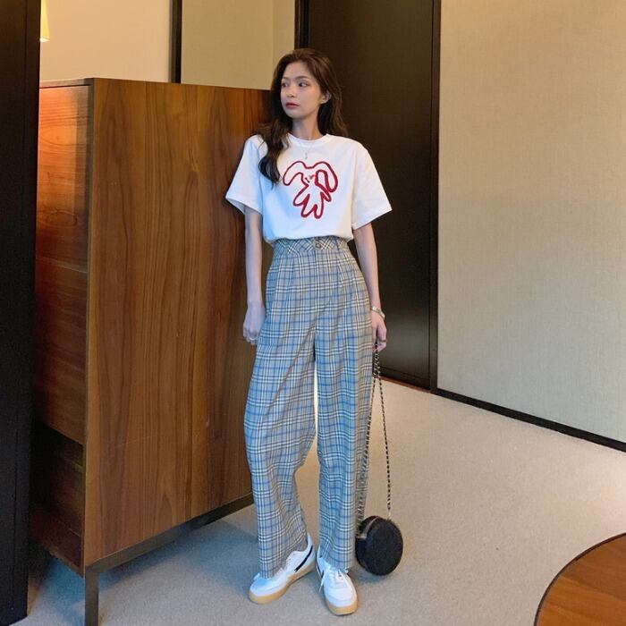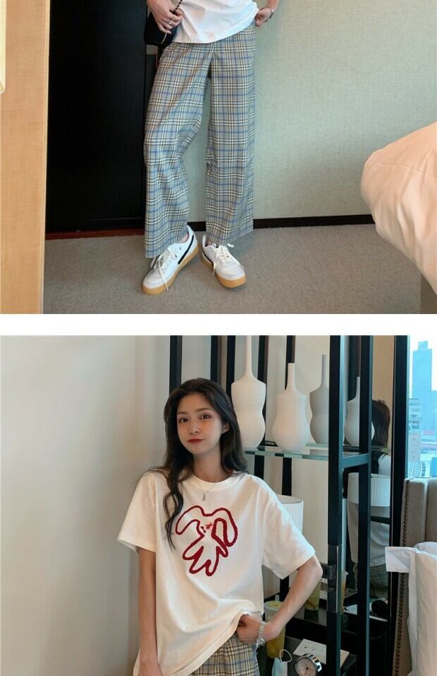 スタイルルーズプリント柄Tシャツ サマーハイウェスト格子柄カジュアルパンツ 夏物 kumikum28113926126