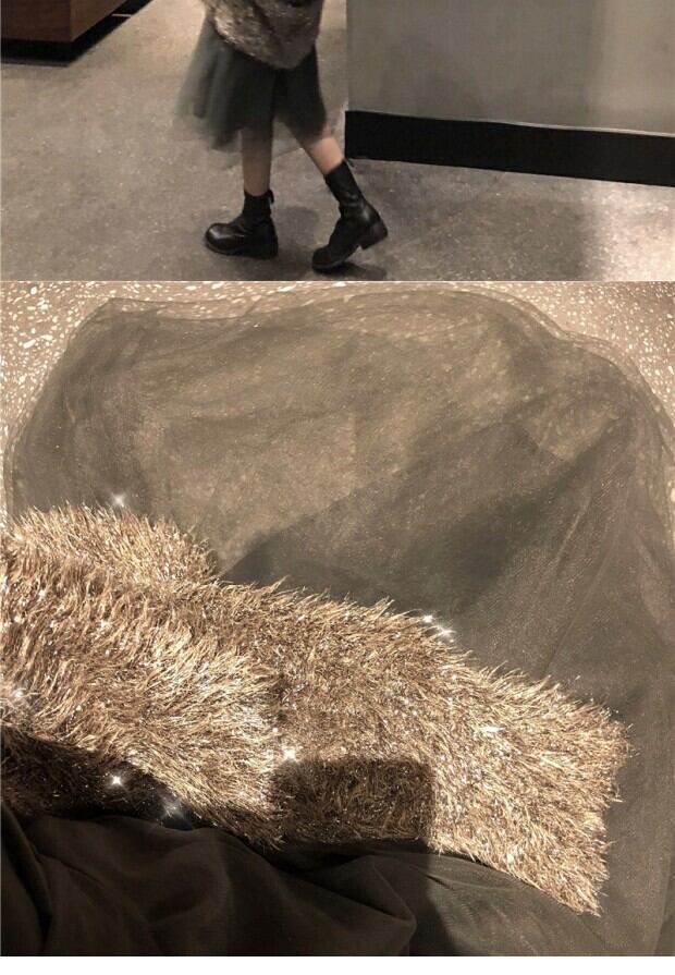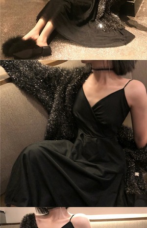 色:ブラックフラッシュゴールドコート,ブラックサスペンダースカート,グレーのドレス