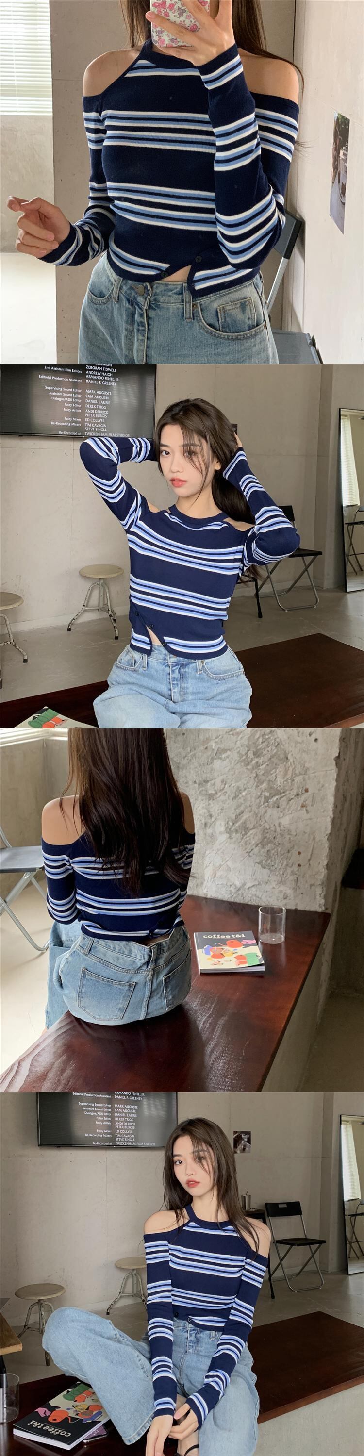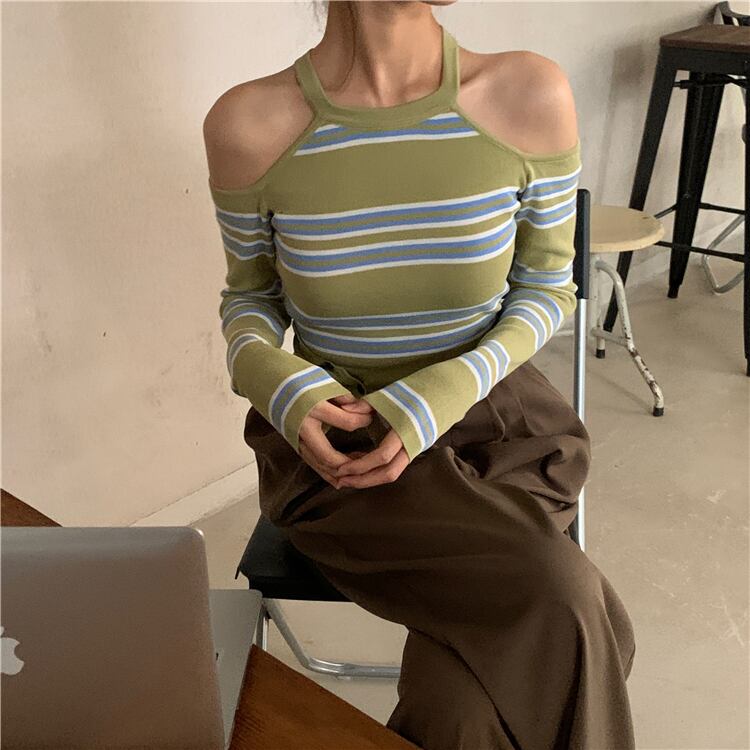 スプリング長袖スリーブTシャツ ストライプストラップレスショートトップス ロング 春物 kumikum26479292466