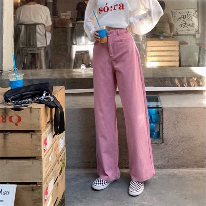 レッドルーズパンツ スプリングハイウェスト薄手カジュアル ピンク 春物 kumikum49289821392