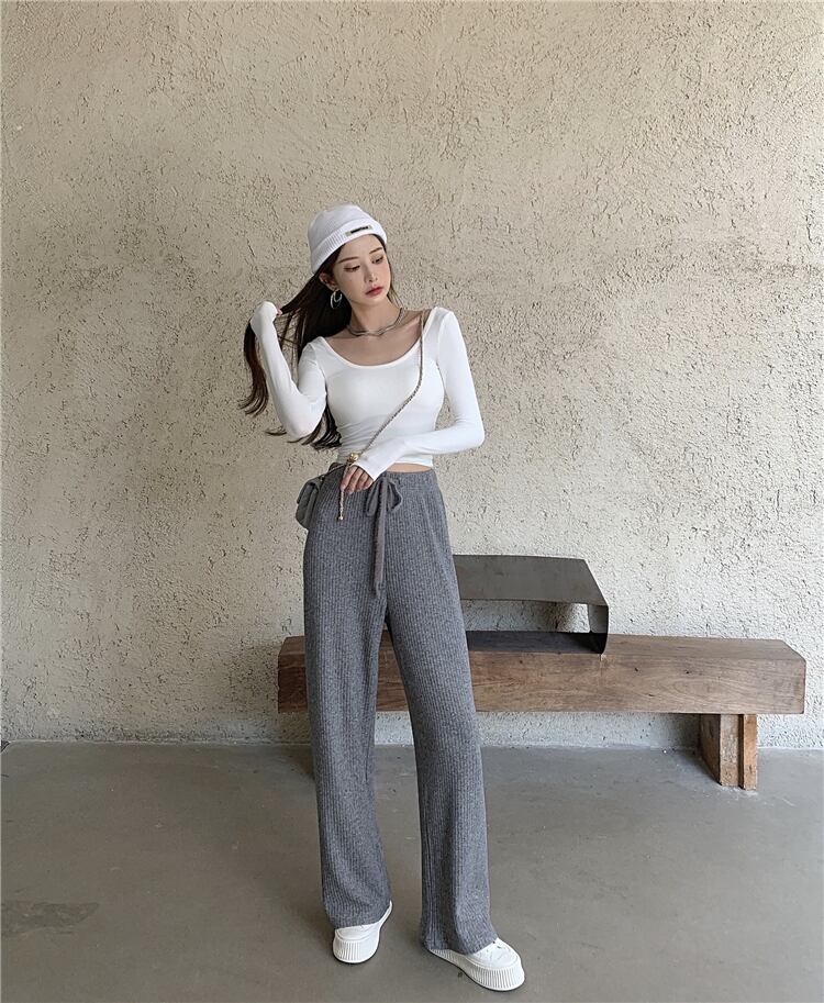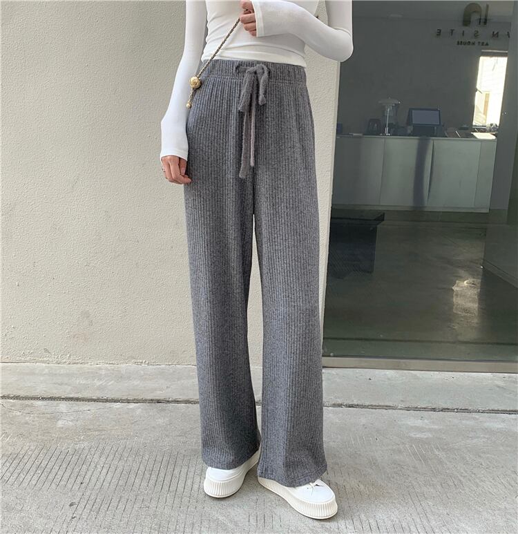 グレーパンツ スプリングストライプギャザーカジュアルハイウェストウェスト 春物 kumikum17688109054