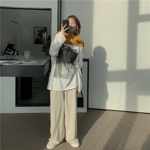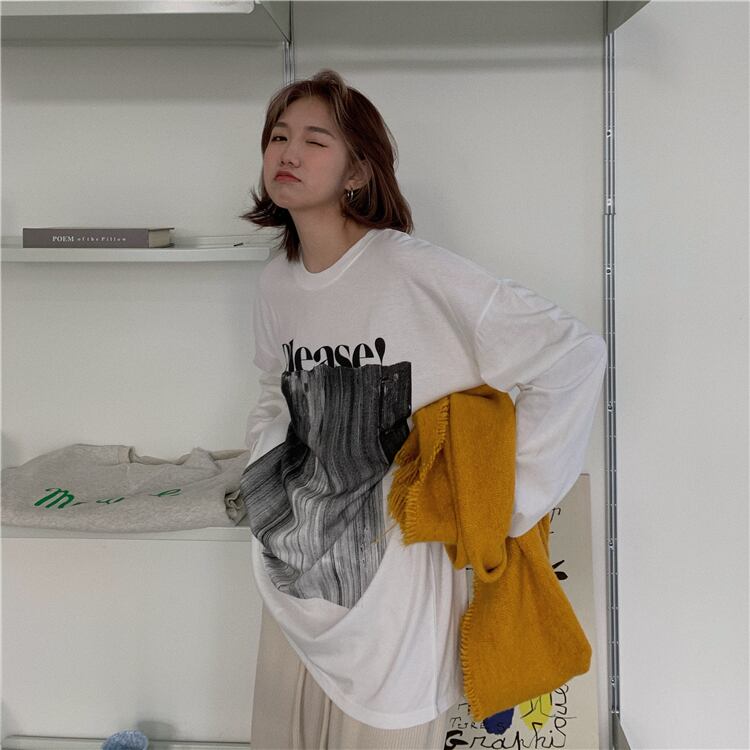 プリントラウンドネックシャツ スプリングルーズTシャツ ロング 春物 Oネック kumikum10518169295
