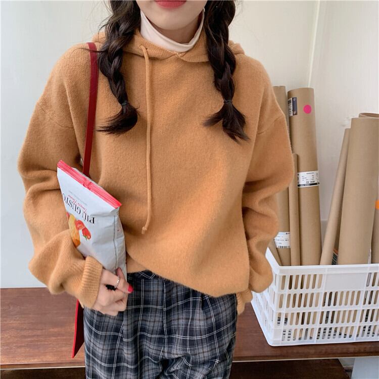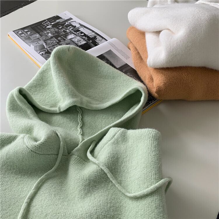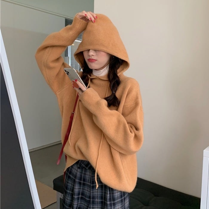 スプリングルーズフードニットセーター カラープルオーバー トップス ロング 春物 ピュア kumikum14458172941