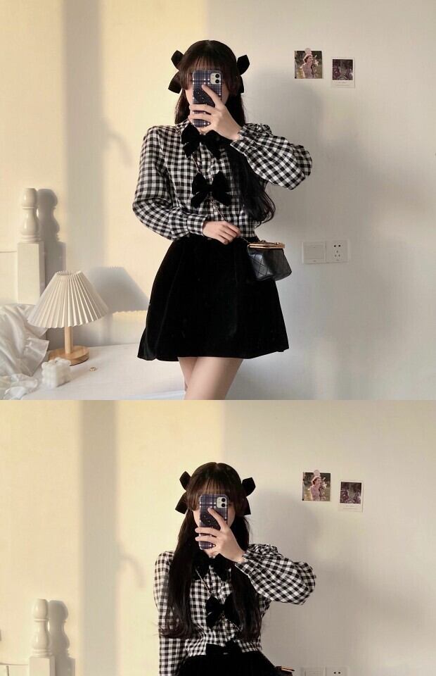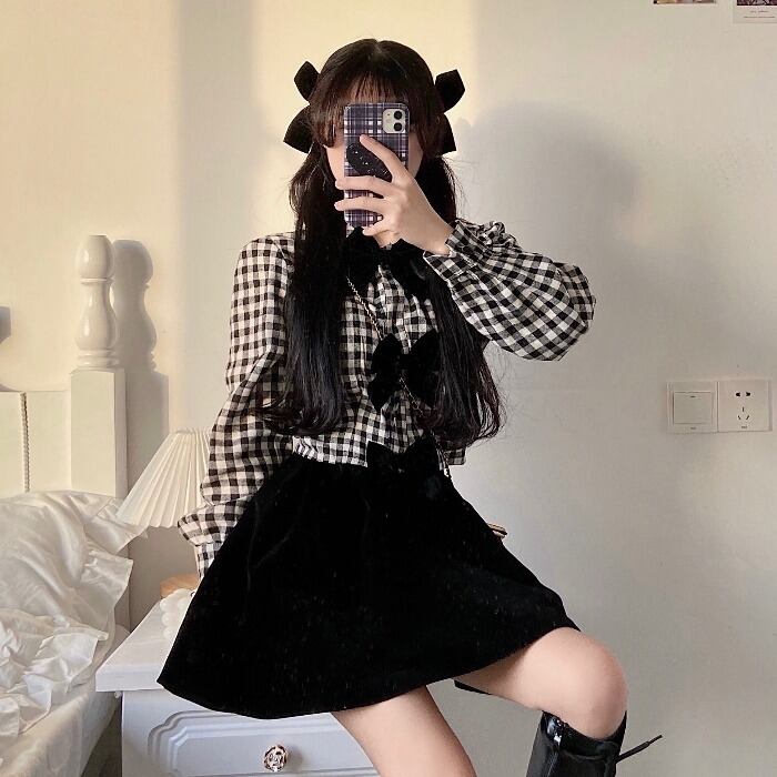 色:チェック柄トップ,黒スカートS,黒スカートM