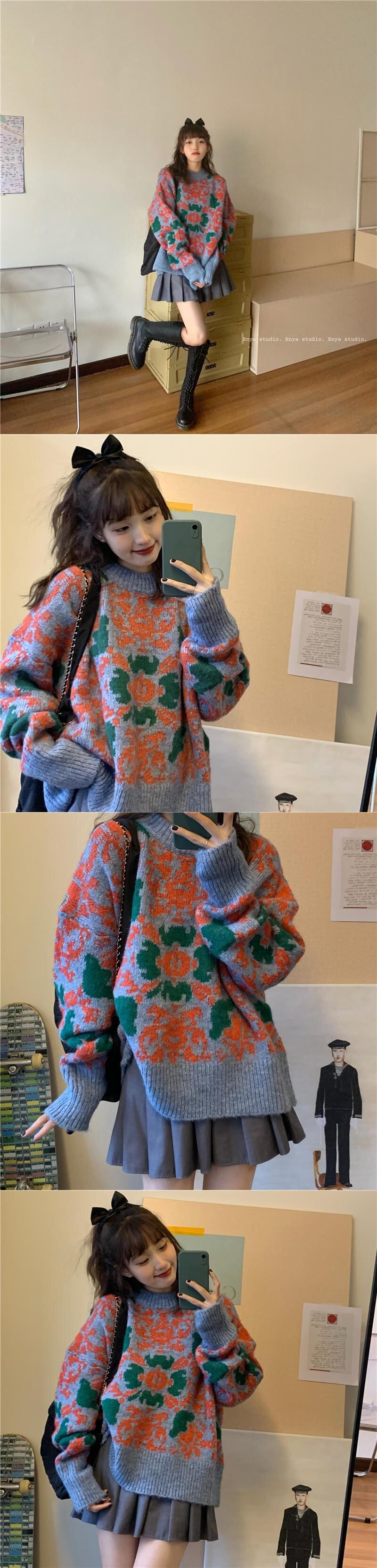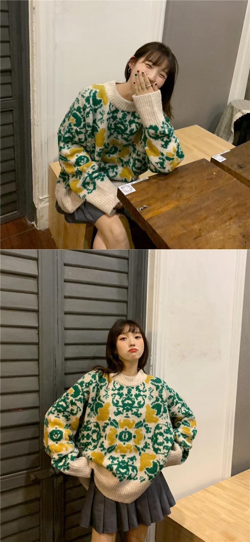スタンダードカラージャカードラウンドネックニットセーター トップス スプリングルーズプルオーバー ロング レトロ 春物 Oネック kumikum89048755119
