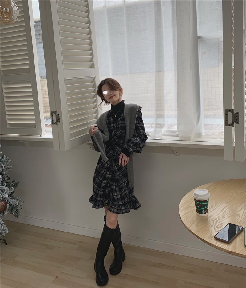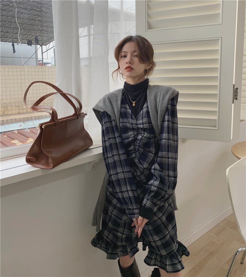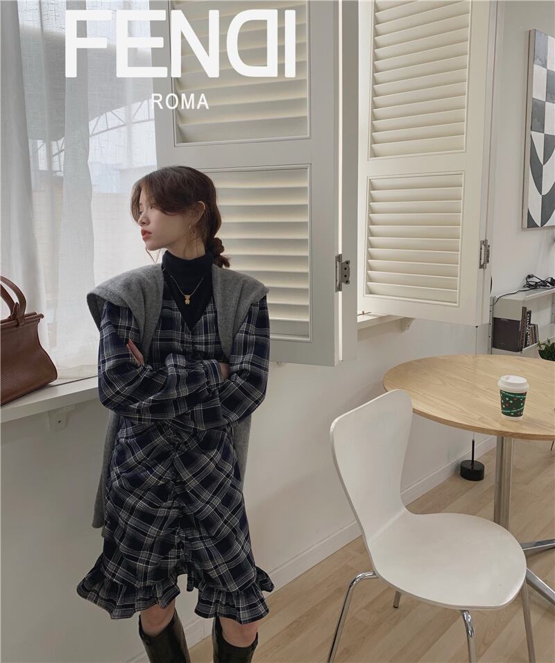 スタンダードウェストプリーツVネック格子柄ドレス スプリングスカート ロング レトロ 春物 kumikum60686811583