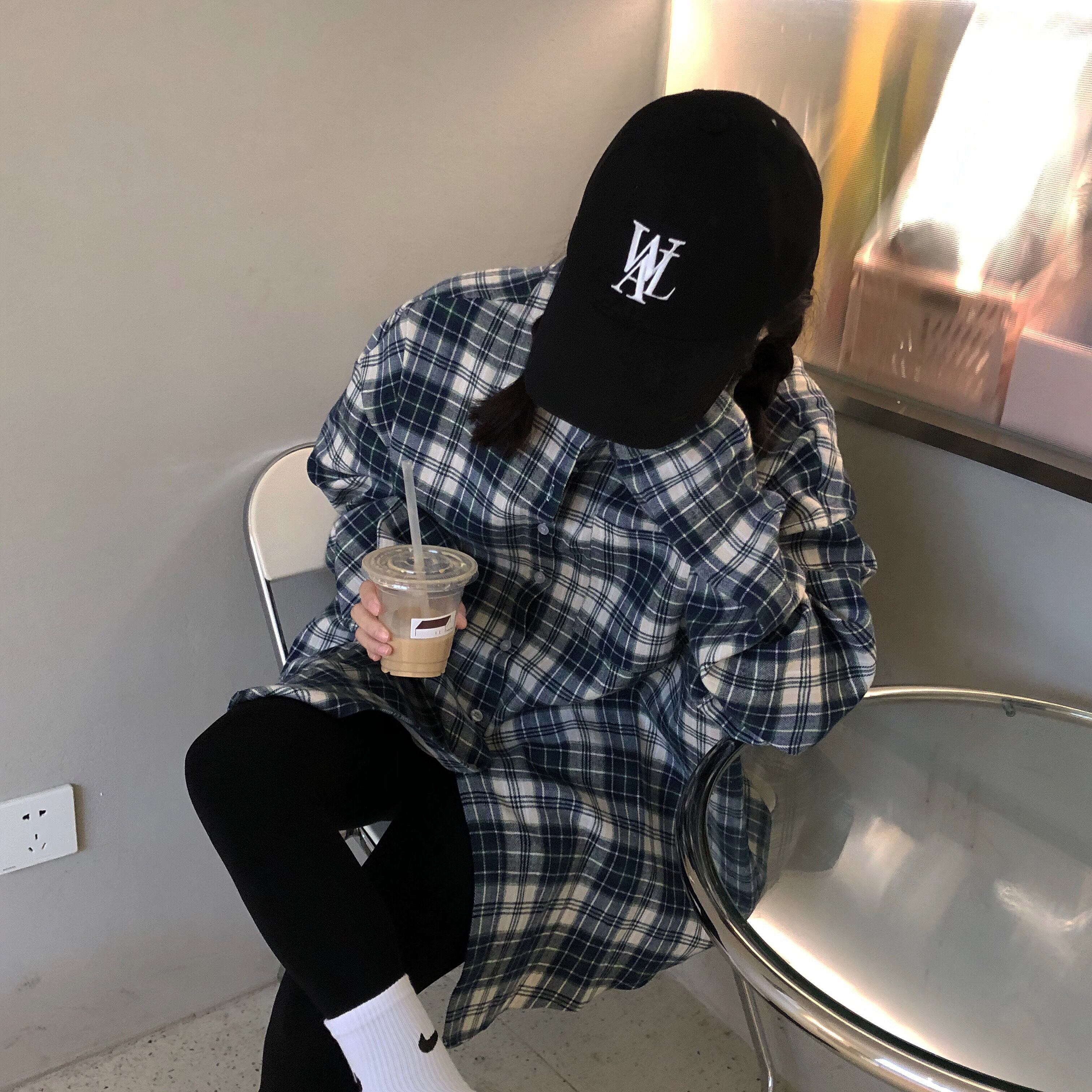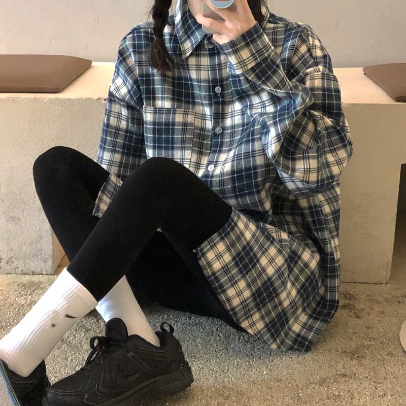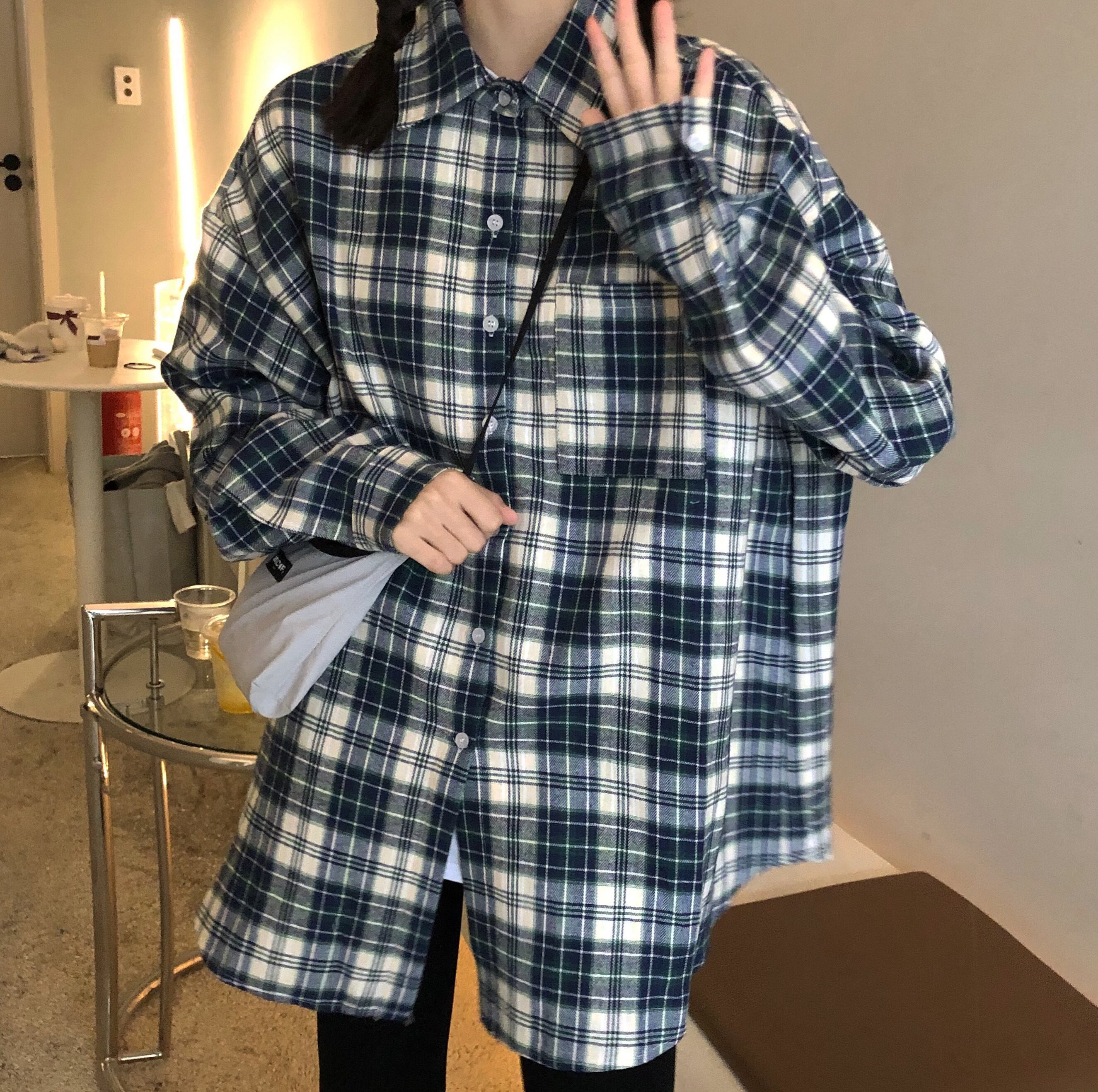 スプリングスタンダードルーズ格子柄シャツ ジャケット ロング レトロ 春物 kumikum44141408248