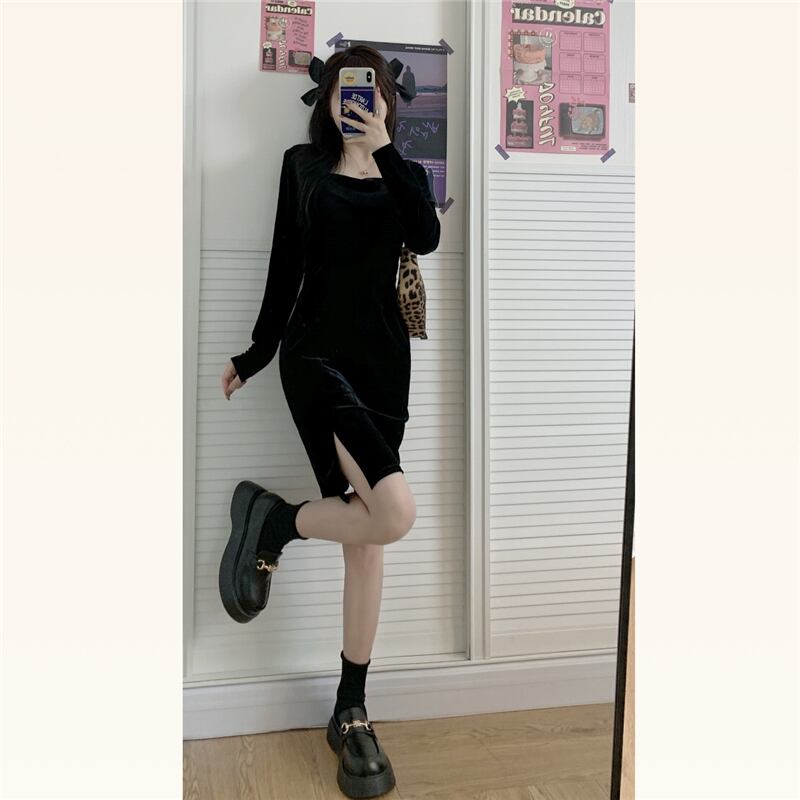 ベルベットブラックドレス スプリングウェストAラインショート 春物 スカート kumikum73717115400