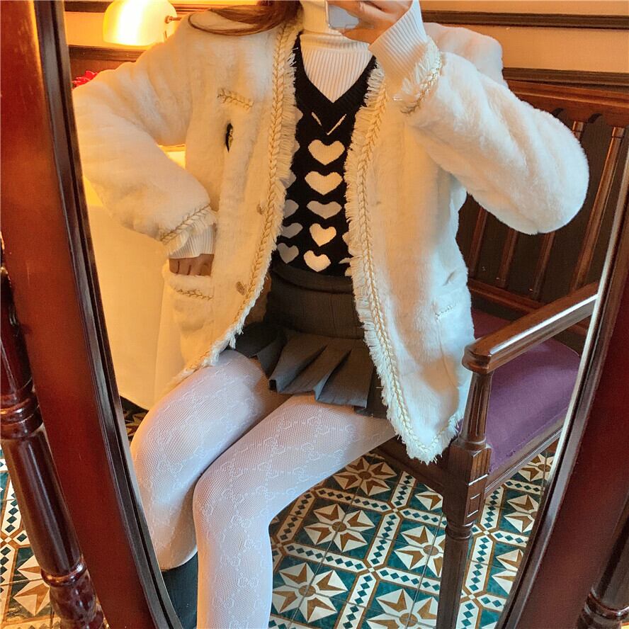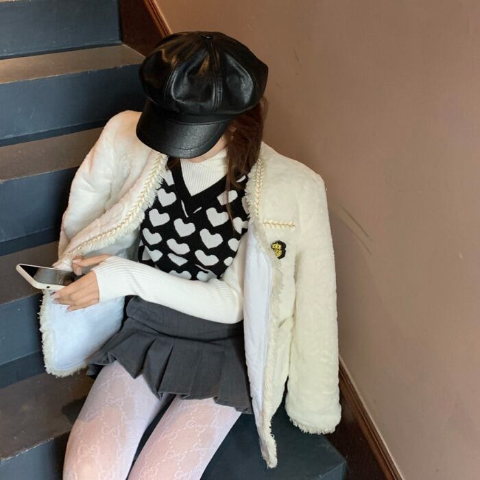 色:ファーコート609,タートルネックセーター7631,ラブベスト7628,プリーツスカート606