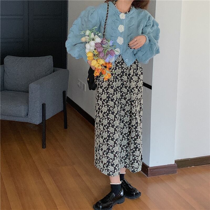 スタイルスリーブニットトップス スプリングルーズFlowerデザイン カーディガンセーター 春物 フラワーデザイン kumikum57394383244