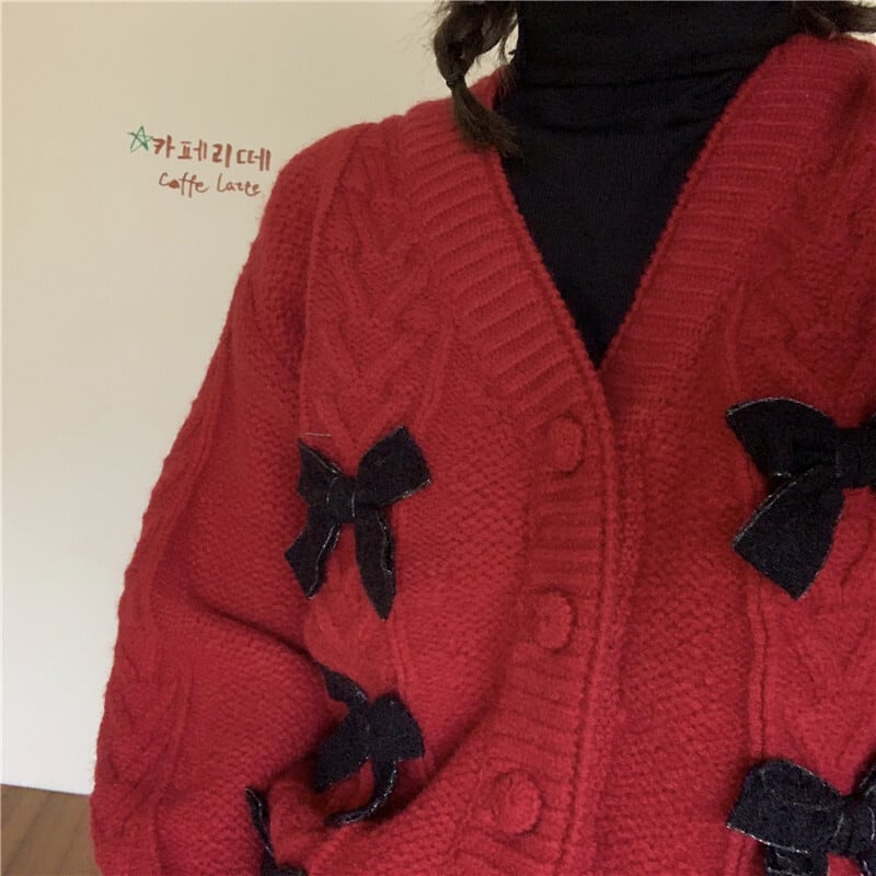 セーター ジャケット レディーススプリングスタンダード長袖スリーブショートニットトップス ロング リボン レトロ 春物 kumikum83689677036