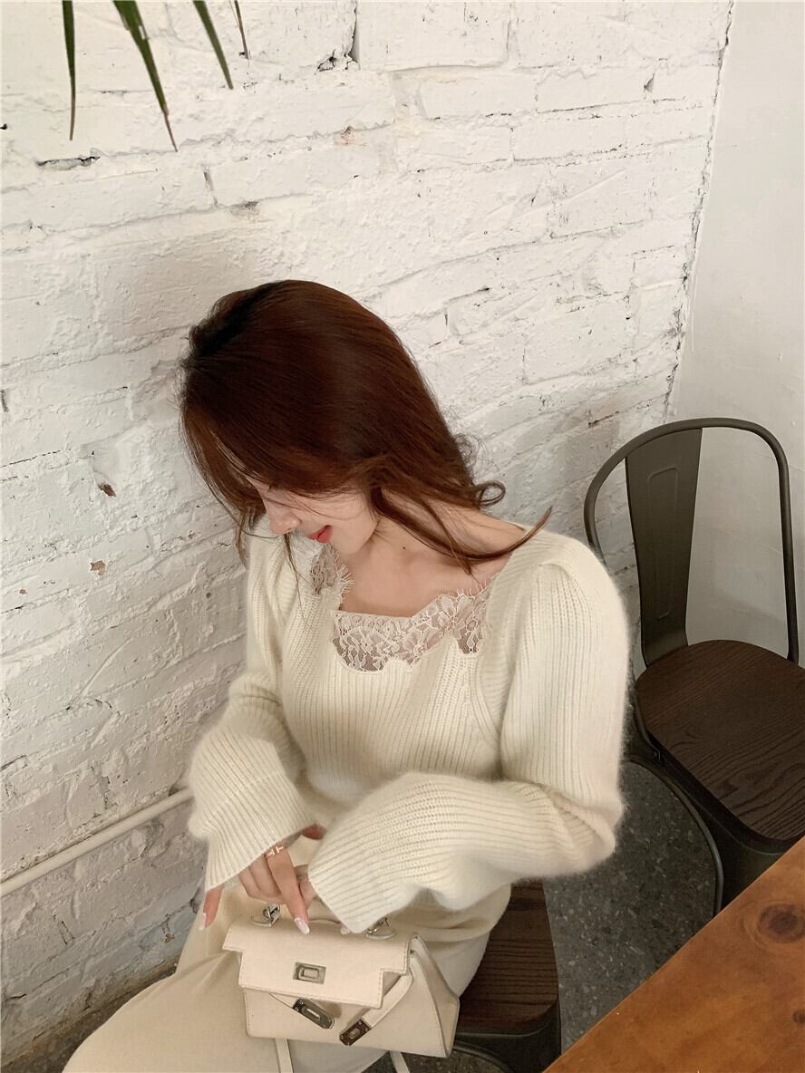 スタイルレースVネックニットシャツ スプリングソリッド カラーショートプルオーバー セーター ロング 春物 ソリッドカラー ステッチ kumikum20376624139