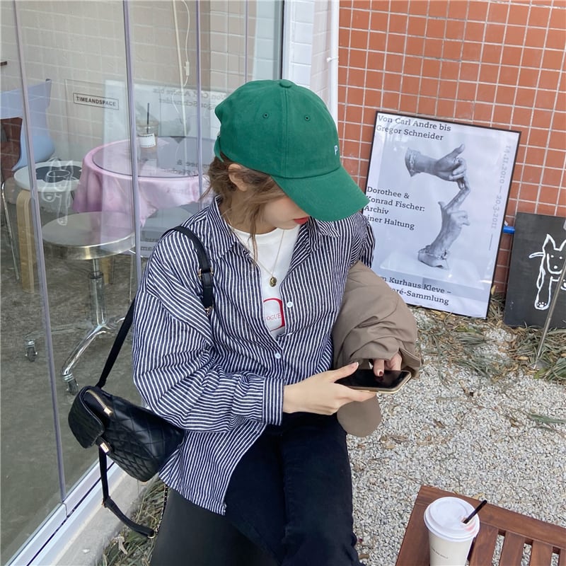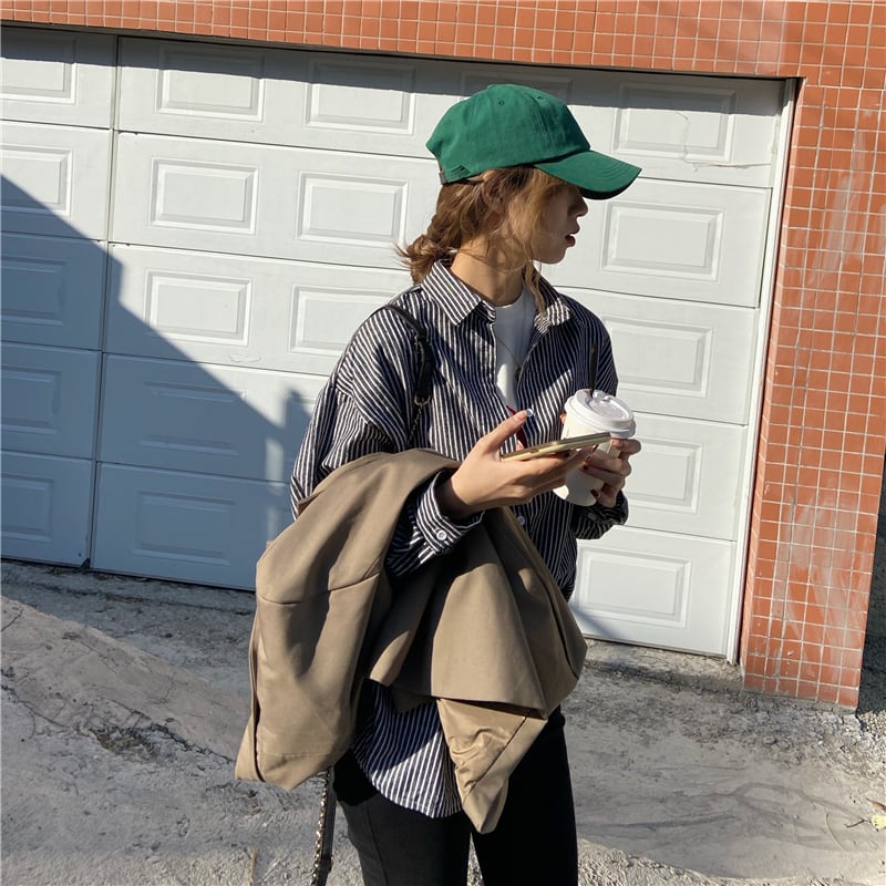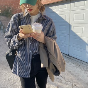 ストライプカジュアルシャツ ジャケット スプリングルーズトップス ロング 春物 kumikum56805997889