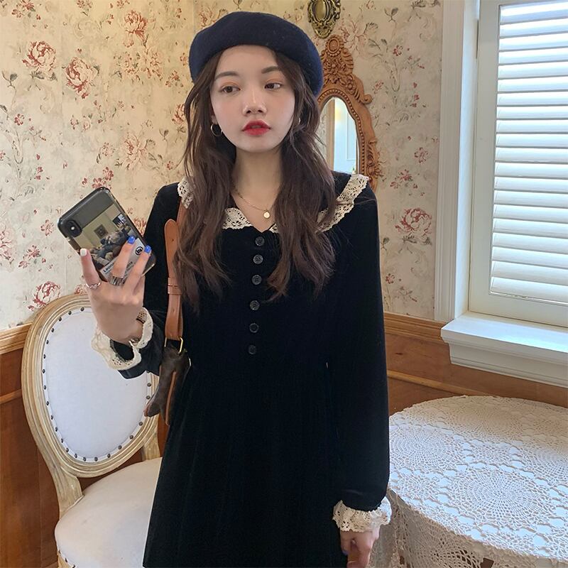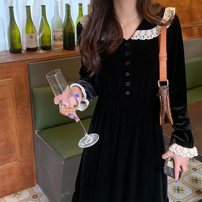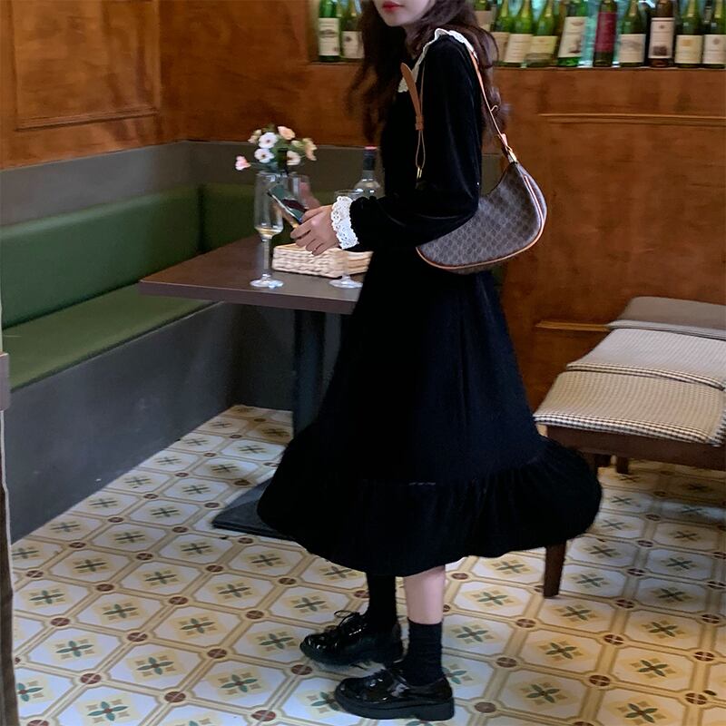 ブラックベルベットウェストドレス オータムウィンター薄手 ロング 秋物 冬物 kumikum54682366272