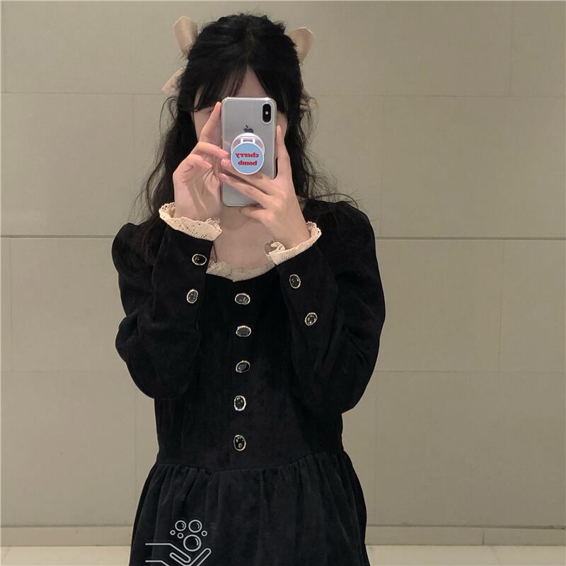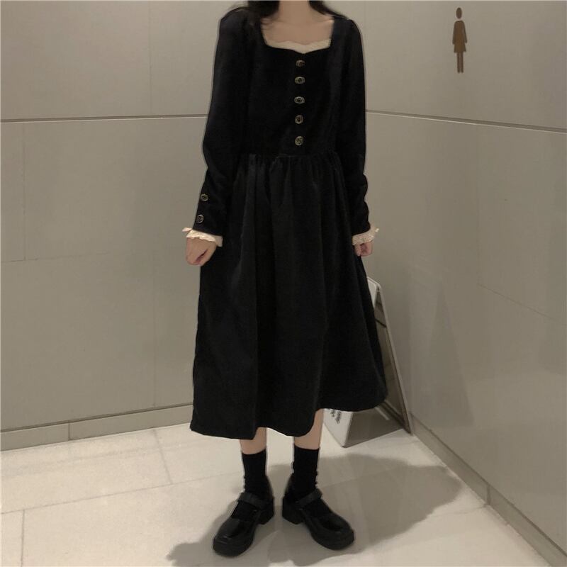 スプリングウェストドレス スタンダードカラーレースコーデュロイAラインスカート レトロ 春物 スクウェア ステッチ kumikum56333579384