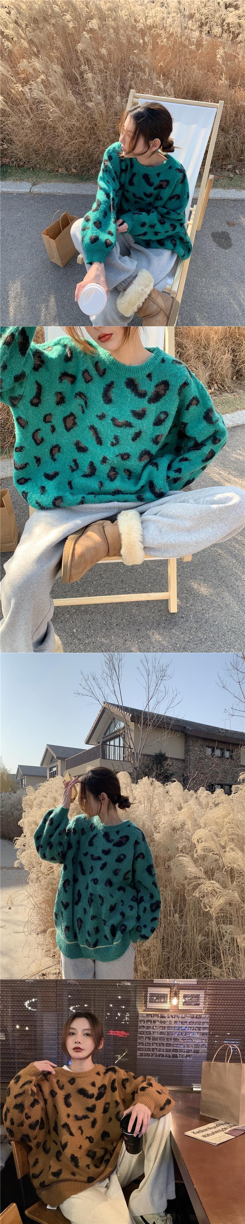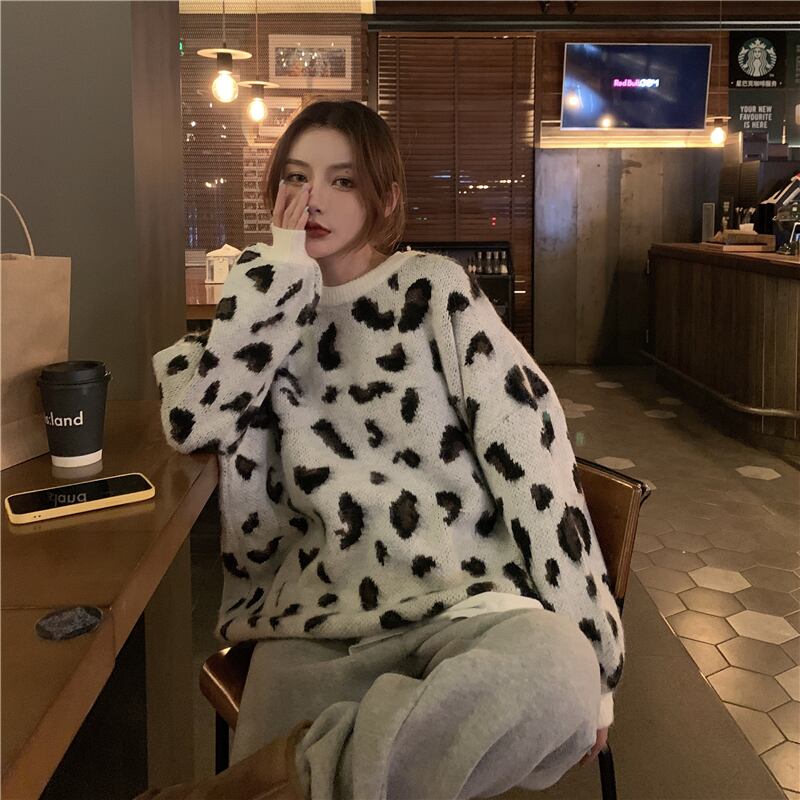 スタンダードルーズレオパードプリント柄セーター レディースウィンターラウンドネック レトロ 冬物 Oネック kumikum63687396721