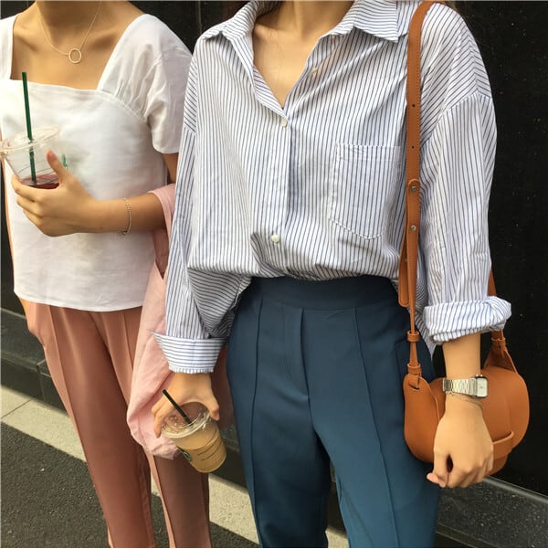 ルーズシャツ 長袖スリーブポケットストライプトップス ロング kumikum88741661951