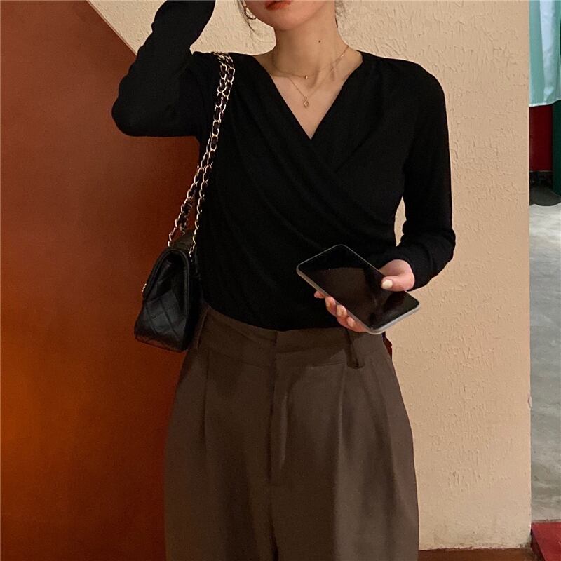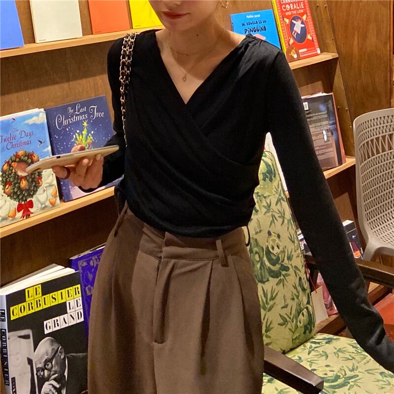 Vネックプリーツニットシャツ レディースウィンタースリムTシャツ トップス ロング 冬物 kumikum82774006751